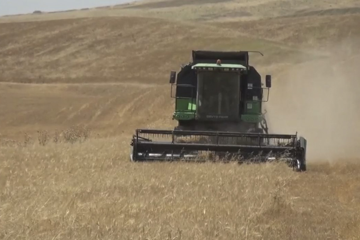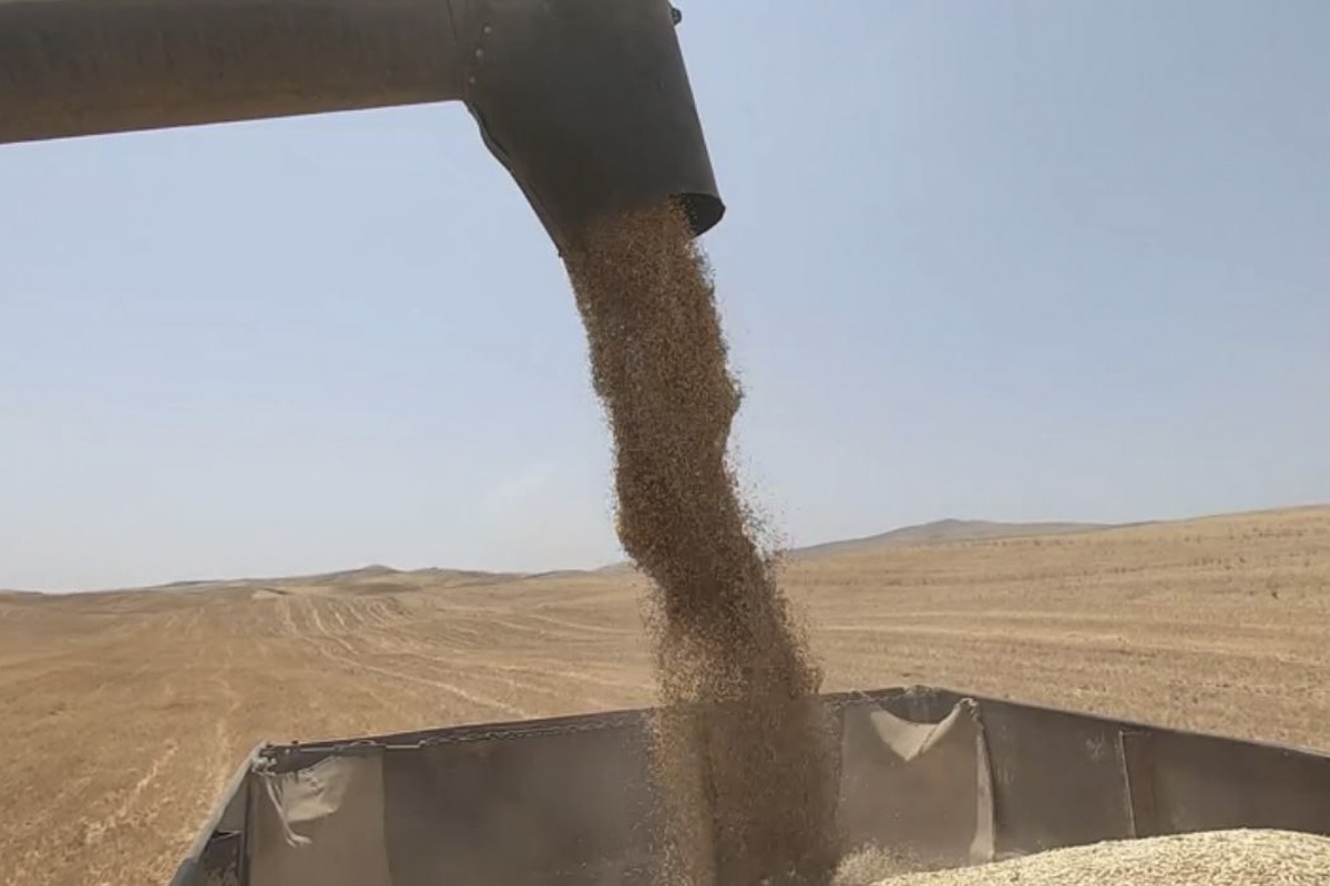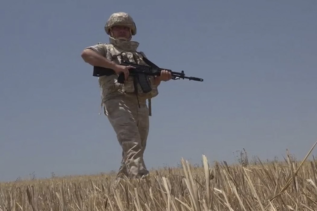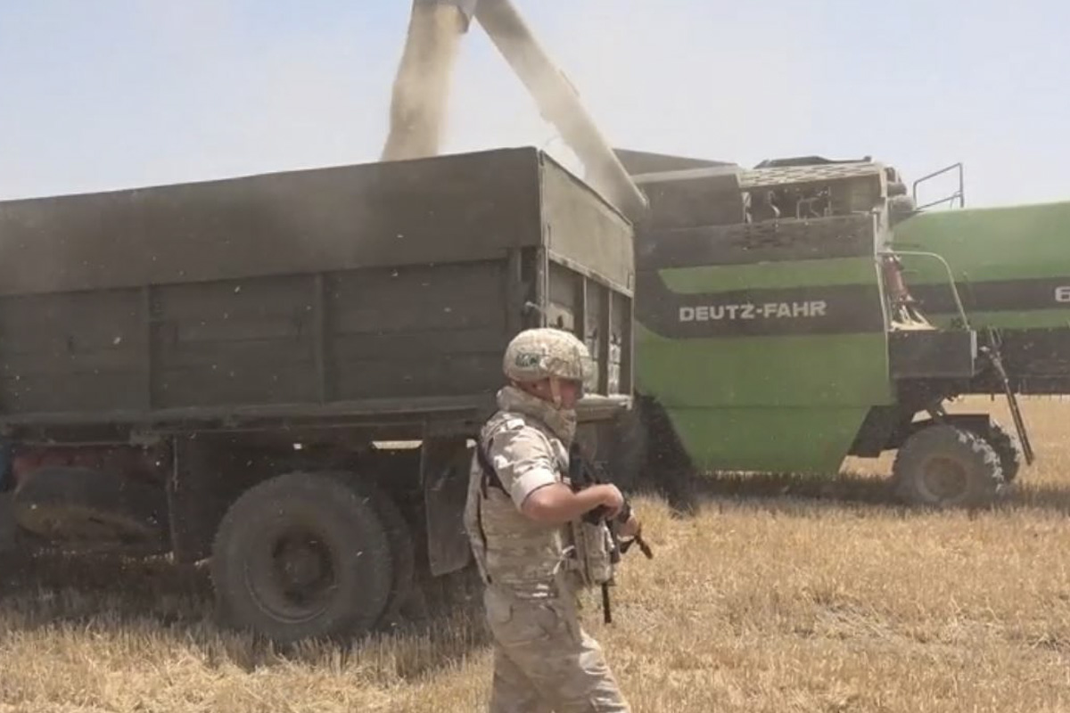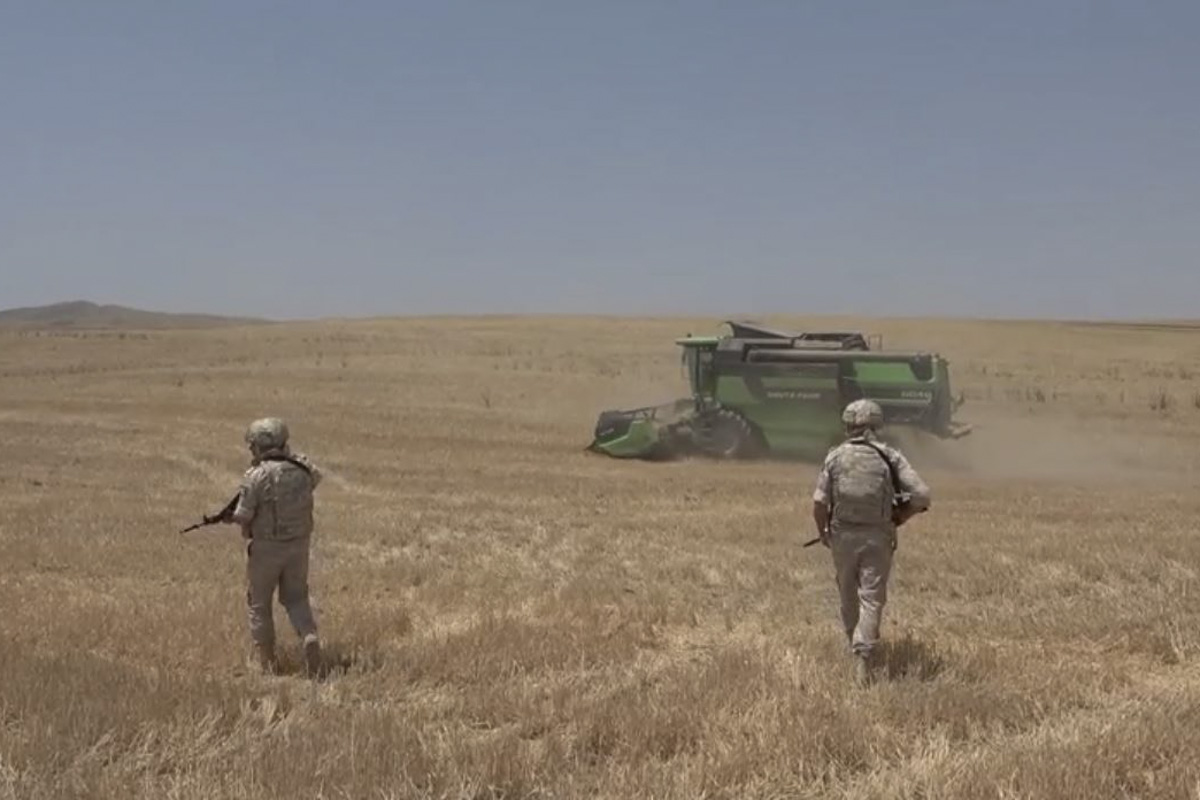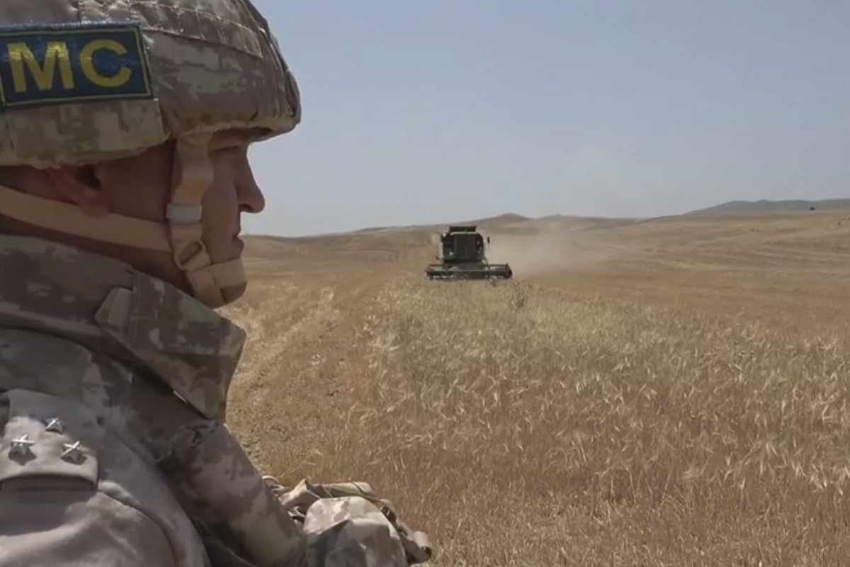 Rus sülhməramlıları Dağlıq Qarabağın Xocavənd rayonunda (məlumatda Martuni rayonu yazılır) taxıl biçən yerli sakinlərin təhlükəsizliyini təmin edirlər.