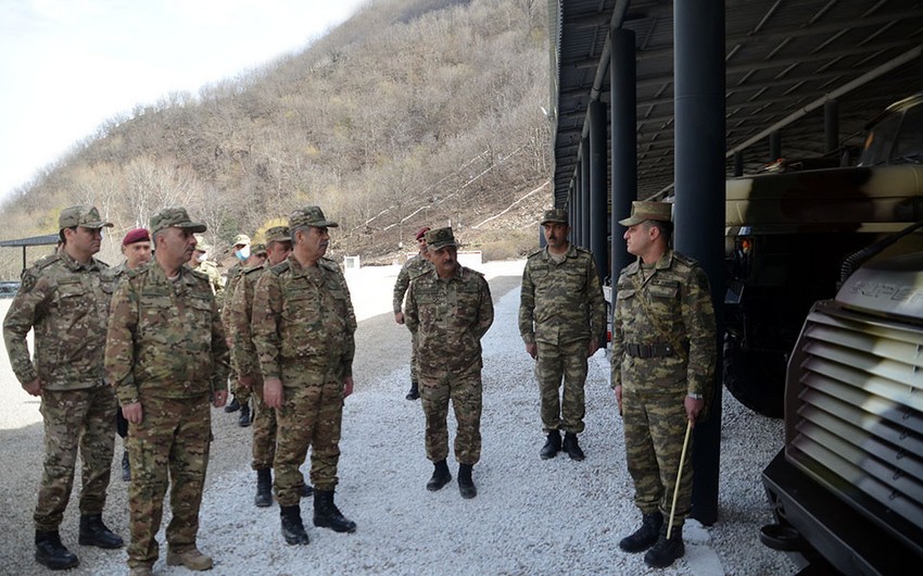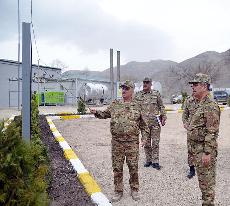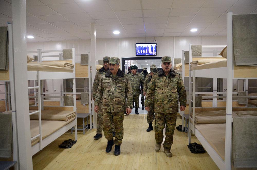 Sonra nazir Kəlbəcər və Laçın rayonlarında yeni istifadəyə verilmiş hərbi obyektlərə baxış keçirib. Məruzə olunub ki, müasir tələblər nəzərə alınmaqla yeni inşa edilmiş hərbi infrastrukturlarda şəxsi heyət üçün lazımi şərait yaradılıb. Binalar bütün zəruri ehtiyacları təmin etmək məqsədilə müasir avadanlıq, mebel və inventarlarla təchiz edilib. Burada silah otağı, yataqxana, yeməkxana, mətbəx, tibb məntəqəsi, ərzaq və əşya anbarları, hamam-sanitar qovşağı və ərazini fasiləsiz elektrik enerjisi ilə təmin edən generatorlar mövcuddur.