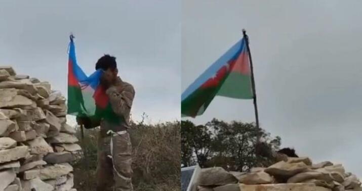 Görüntülərdən aydın olur ki, Silahlı Qüvvələrimizin əsgəri Xocalıda düşməndən azad olunmuş döyüş postuna Azərbaycan bayrağını sancır və “Qarabağ Azərbaycandır!” şüarı səsləndirir.