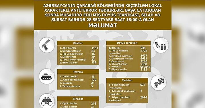 Qarabağda müsadirə edilmiş döyüş texnikası, silah və sursatın bugünədək olan siyahısı açıqlanıb.