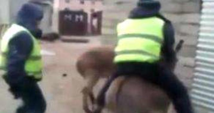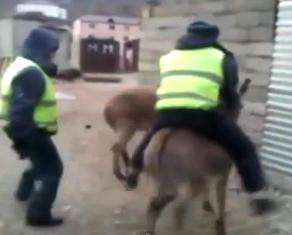 Ancaq bu ideya heyvanlardan birinin ürəyincə olmayıb. Polislərdən biri effektli kadr üçün eşşəyin belinə minən kimi o kamera qarşısında tullanmağa başlayıb və nəticədə güc strukturunun əməkdaşını belindən aşırıb.