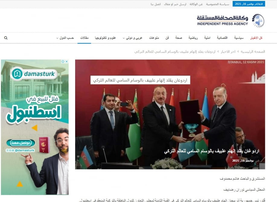 İordaniyanın “Nayrouz” informasiya agentliyinin saytında, həmçinin Küveytin “q8press”, İraqın “Əfkar Hürə” və “Mustağila” portallarında azərbaycanlı şərqşünas Həşim Məmmədov və siyasi şərhçi Turan Rzayevin Türk Şurasının İstanbulda keçirilən VIII Zirvə Görüşündə Azərbaycan Prezidenti İlham Əliyevə Türk Dünyasının Ali Ordeninin təqdim edilməsi barədə məqalə dərc edilib.