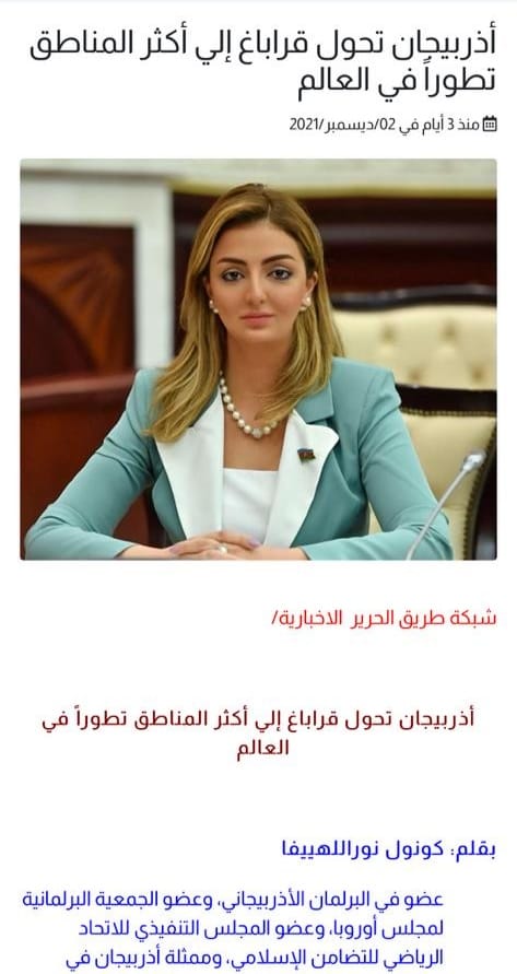 Milli Məclisin deputatı Könül Nurullayeva #ərəb ölkələrinin nüfuzlu mətbuat orqanlarında işğaldan azad olunan #Qarabağ və Şərqi #Zəngəzur bölgəsinin bərpasından yazıb. Məqaləni 4-ü #Misir, 1 #Əlcəzair, 5 #Sudan, 2 #İraq və 1 #Yəmən olmaqla 13 mətbuat orqanı dərc edib.