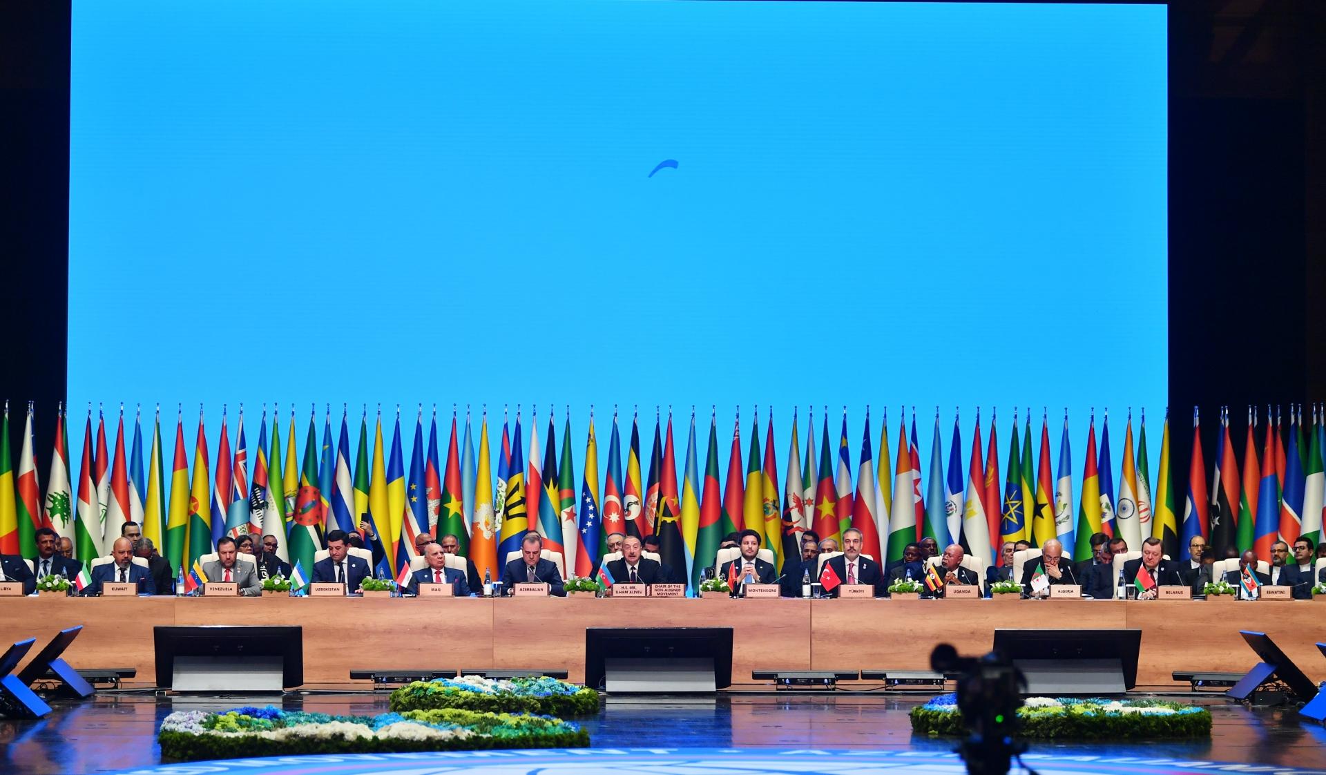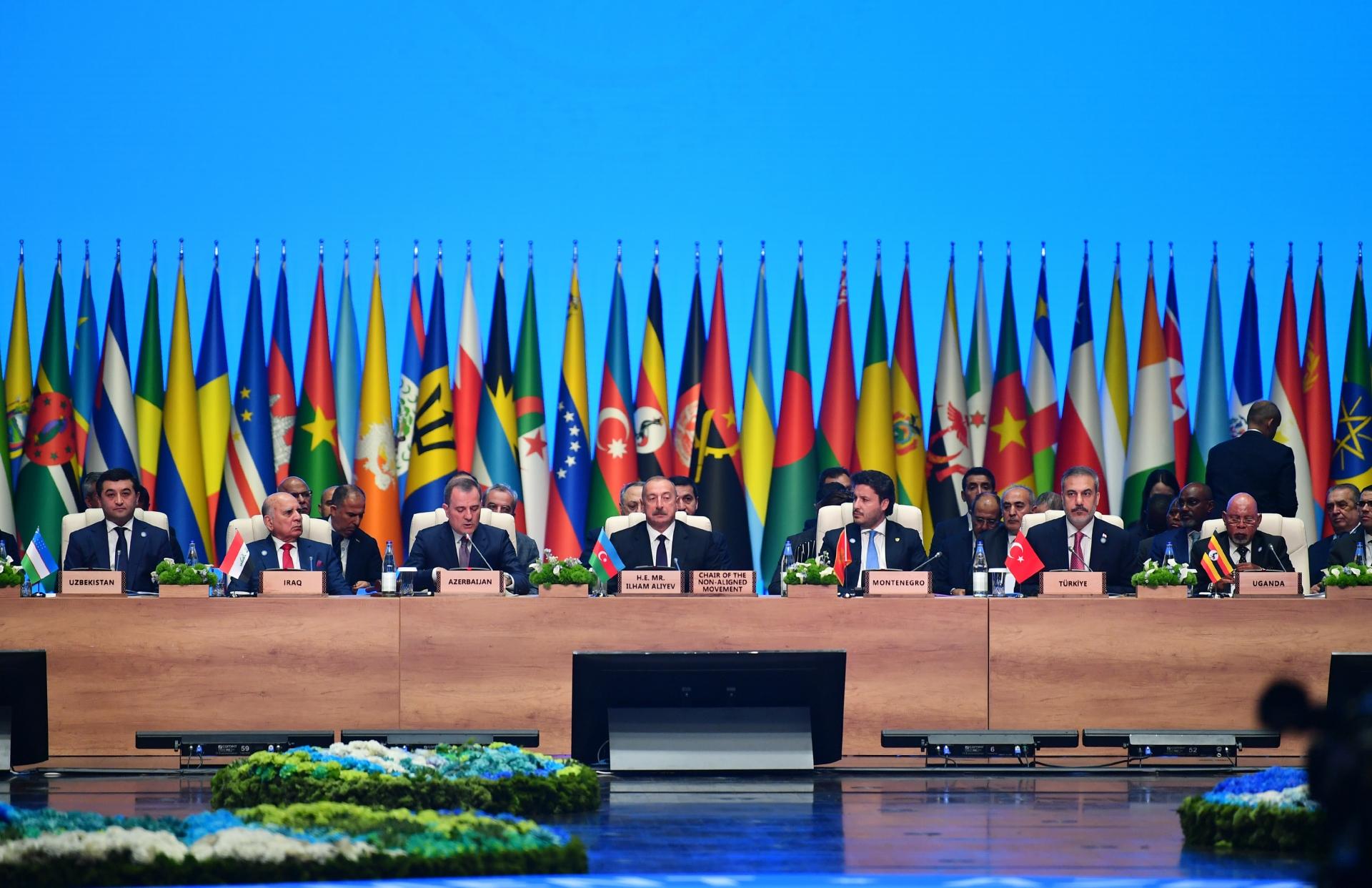 Xanımlar və cənablar, multilateralizmin əsl müdafiəçisi və BMT-dən sonra ikinci böyük təsisat kimi Qoşulmama Hərəkatı yenidən formalaşan dünya nizamında öz yerini tapmalıdır. Biz “Bandunq prinsipləri” ətrafında qətiyyətlə dayanmalı, suverenliyin və ərazi bütövlüyünün pozulması, ölkələrin daxili işlərinə müdaxilə hallarına qarşı öz səsimizi ucaltmalıyıq. Hərəkatımızın dünya məsələlərində daha ön mövqedə olması mühüm əhəmiyyət kəsb edir.