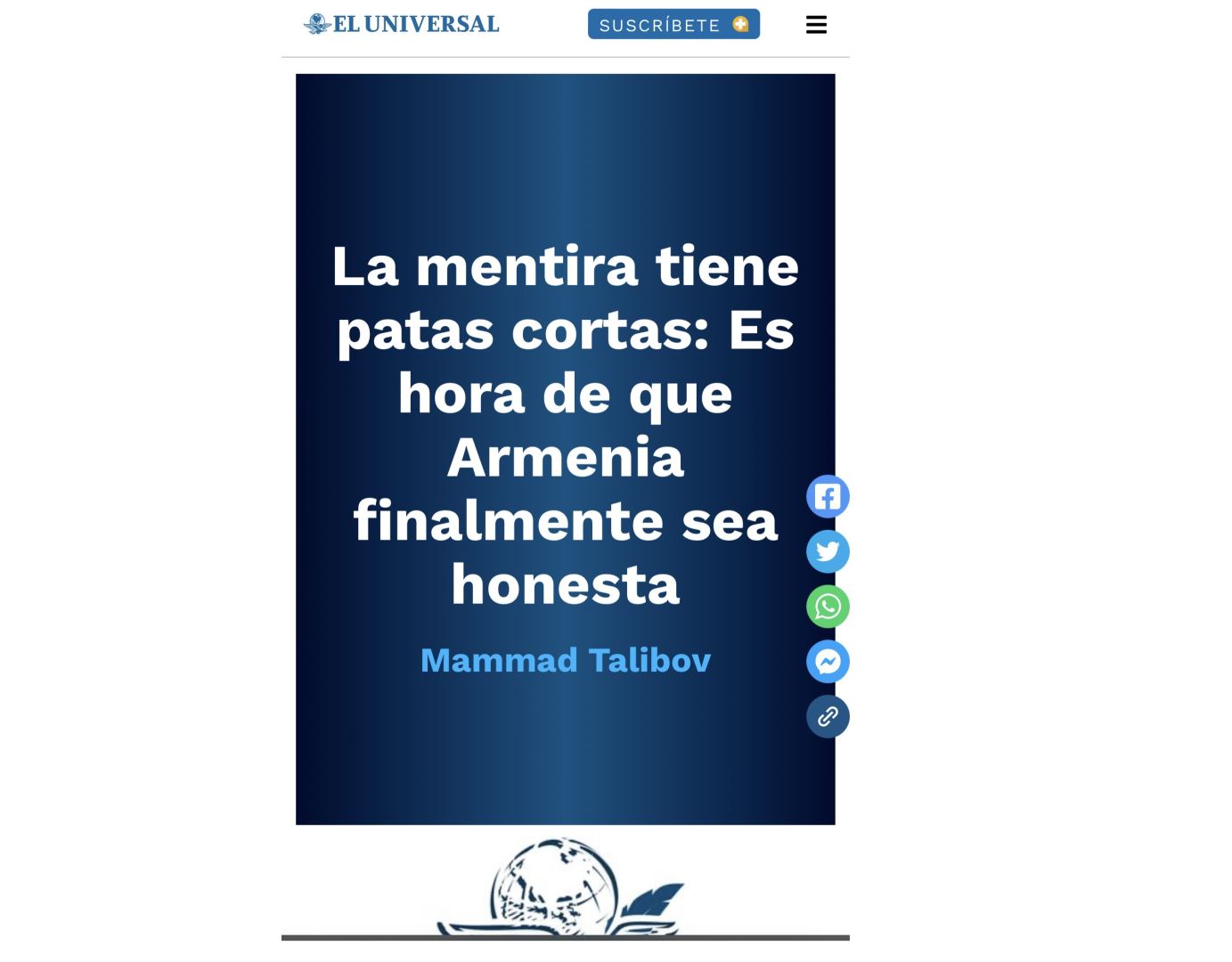 Meksikanın ən çox oxunan “El Universal” qəzetində Azərbaycanın həmin ölkədəki səfiri Məmməd Talıbovun müəllifi olduğu “Yalan ayaq tutar, yeriməz: Ermənistanın səmimi olmağının vaxtı çatıb” başlıqlı geniş məqalə dərc olunub. Məqalə adıkeçən nəşrdə bir neçə gün öncə yayımlanmış Ermənistan xarici işlər nazirinin müavininin yalan və qərəz dolu yazısına cavab olaraq qələmə alınıb.