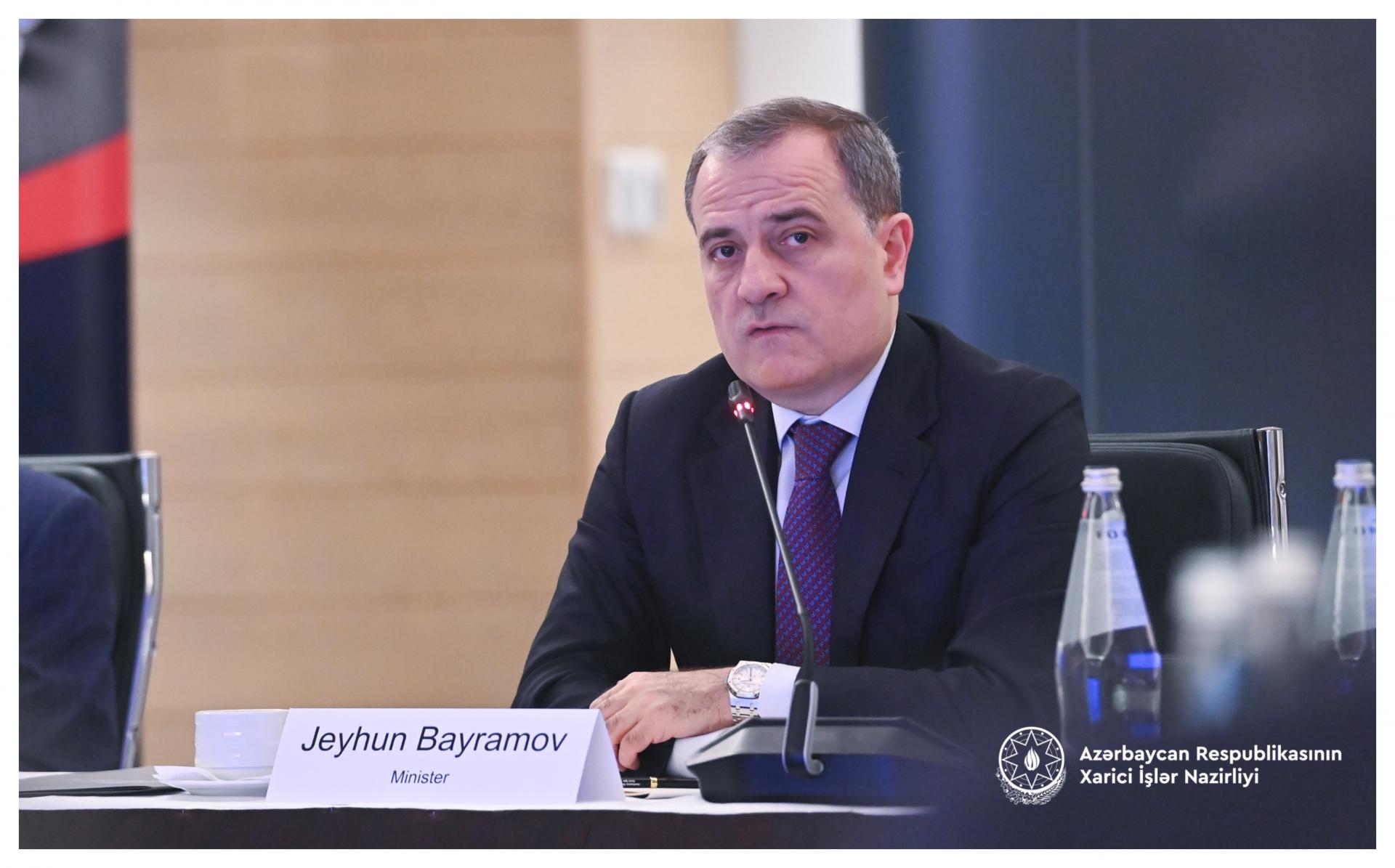 C.Bayramov çıxışı zamanı münaqişədən sonrakı səylər və regional təhlükəsizlik vəziyyəti, işğaldan azad edilmiş ərazilərin yenidən qurulması, mina təhlükəsi, o cümlədən Azərbaycan və Ermənistan sülh prosesi barədə məlumat verib.