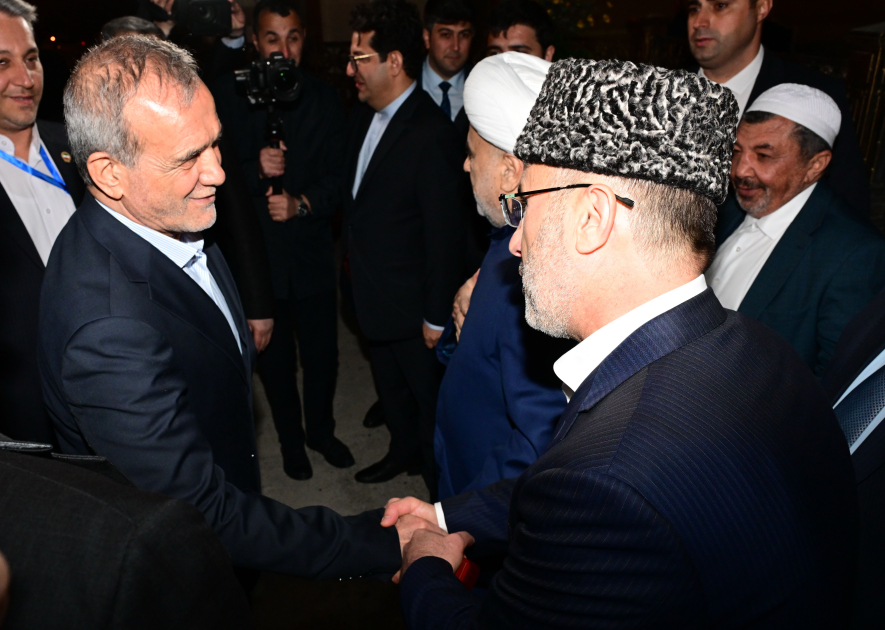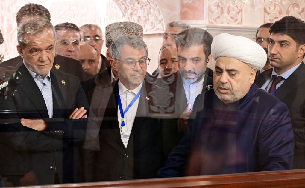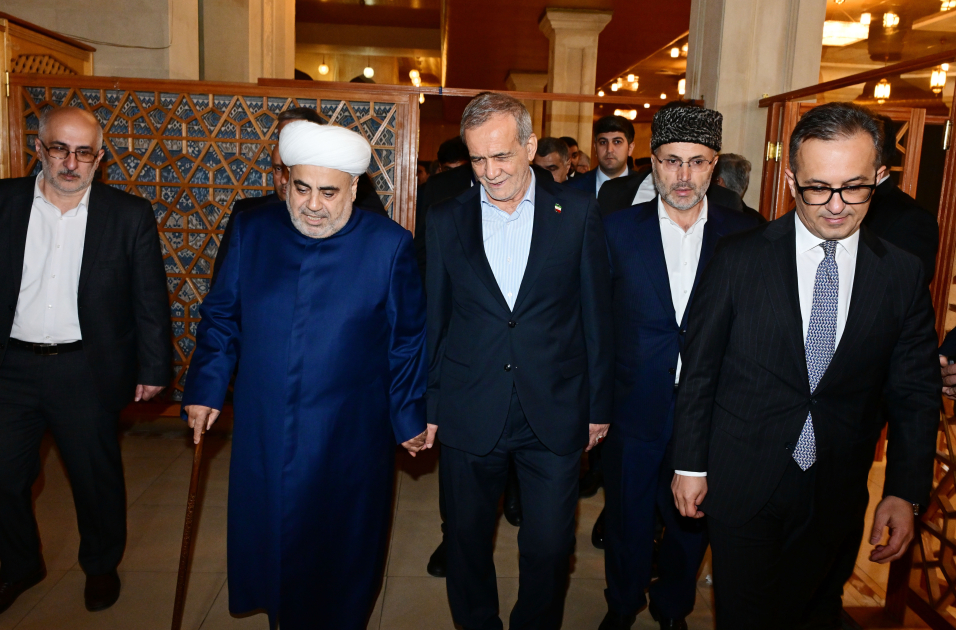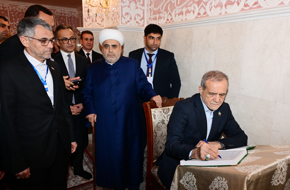 Çay süfrəsi arxasında səmimi söhbət edən İran Prezidenti Məsud Pezeşkian və şeyxülislam Allahşükür Paşazadə bir-birilərinə xatirə hədiyyələri təqdim etdilər.