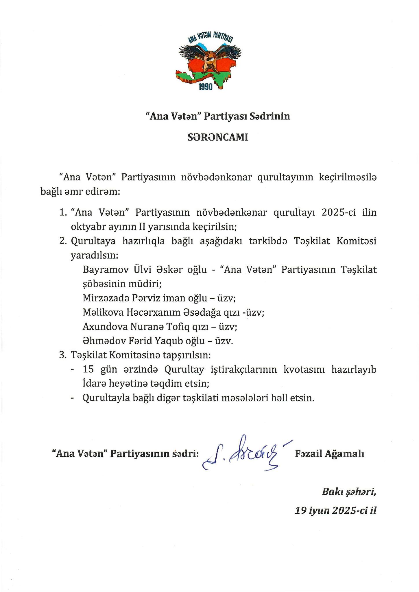 "Ana Vətən" Partiyasının növbədənkənar qurultayı keçiriləcək.