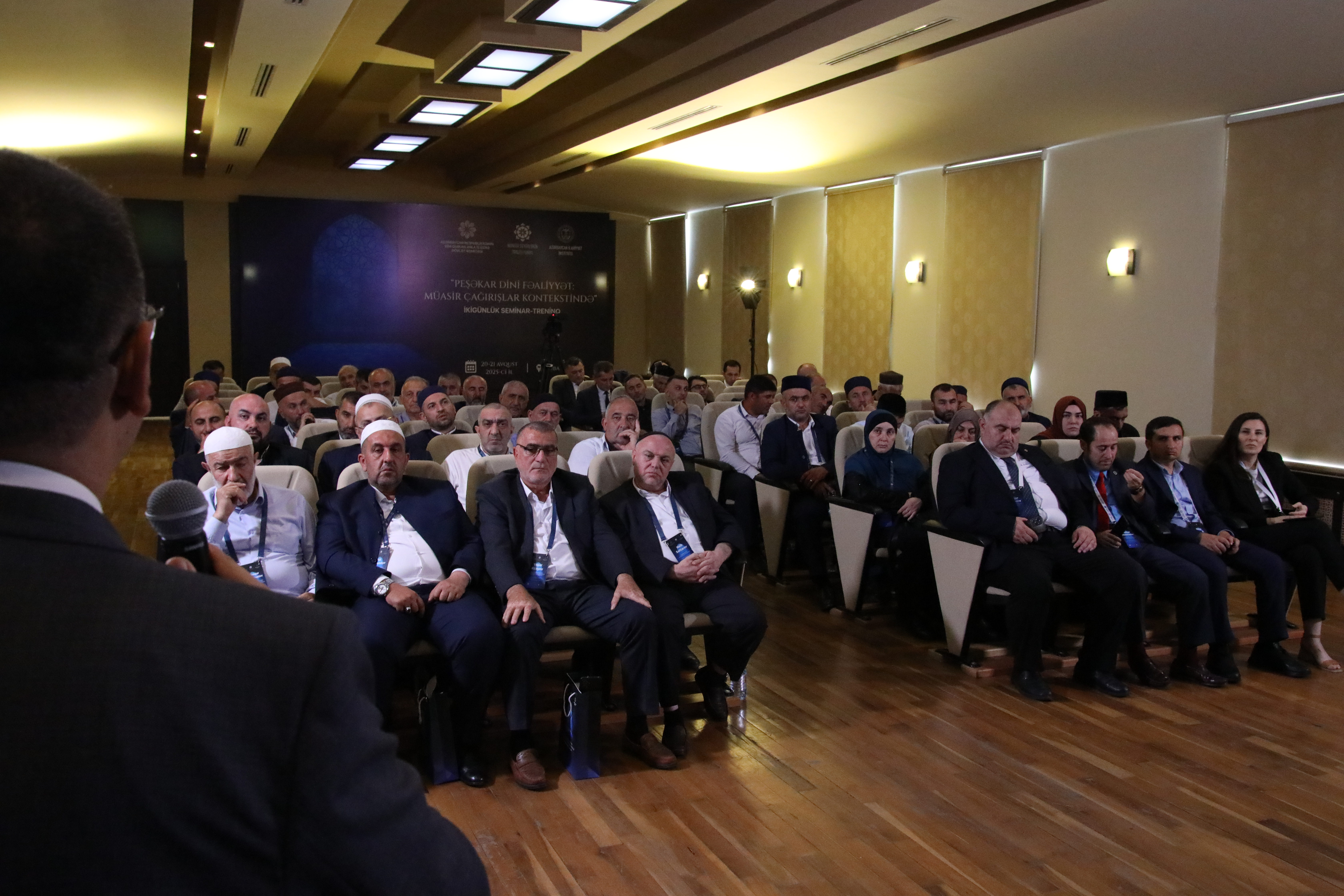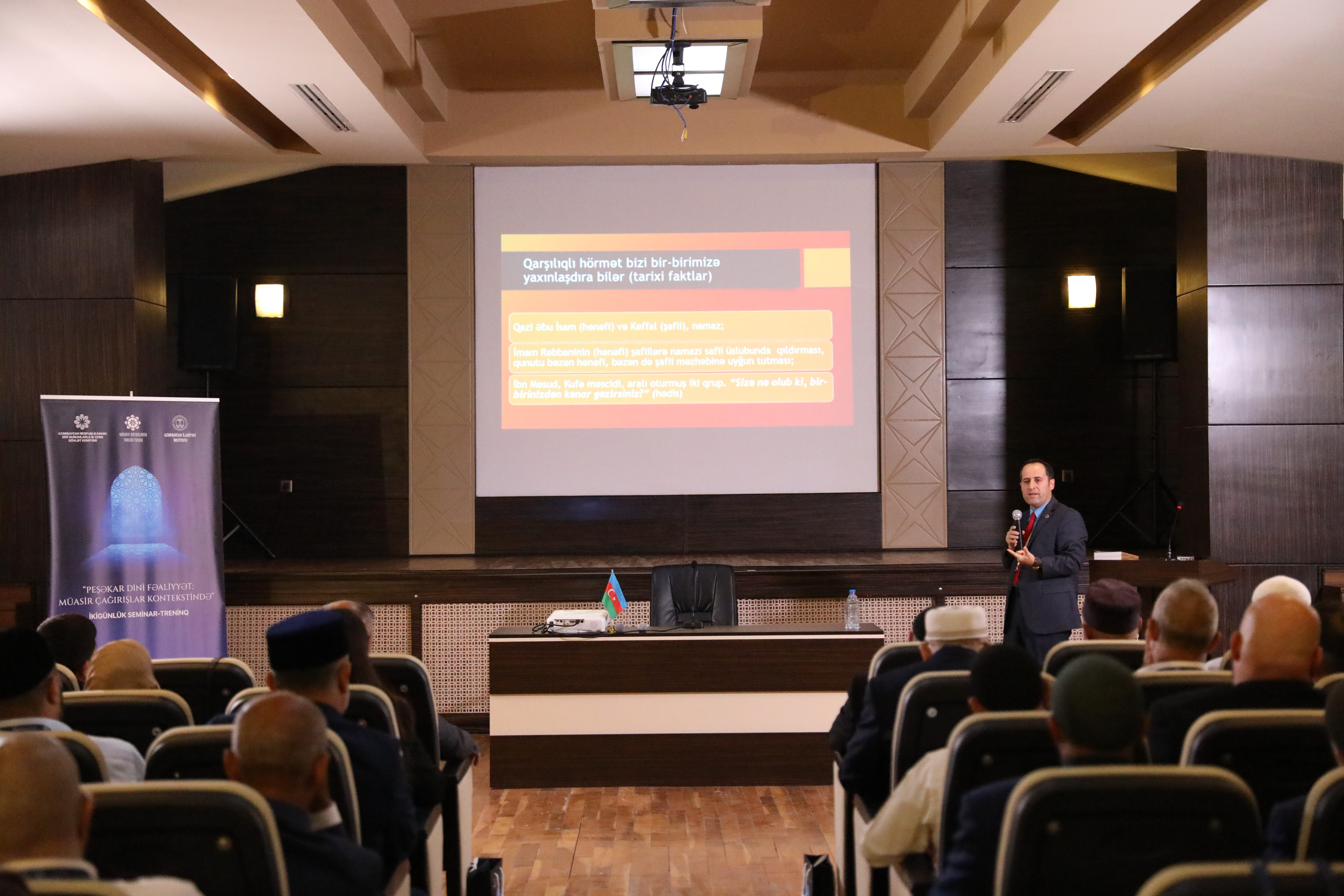 Seminarda Azərbaycan İlahiyyat İnstitutunun İslamşünaslıq kafedrasının müəllimi, “İlahiyyat” məscidinin imamı, fəlsəfə üzrə fəlsəfə doktoru Vüqar Səmədov “Zərərli dini cərəyanlara qarşı mübarizə üsulları” mövzusunda çıxış edib. O bu cərəyanların dini mətnləri radikal şəkildə təfsir edərək ənənəvi İslam təlimlərinə və milli-mədəni irsə zidd mövqelər sərgilədiyini qeyd edib. Onların dini birliyə qarşı yönəlmiş fikirlər yayması cəmiyyətdə parçalanma yaradır. Məruzəçi vurğulayıb ki, bu yanaşmalara qarşı maarifləndirmə, sağlam dini bilgilərin təbliği və ənənəvi dini təcrübələrin müdafiəsi vacibdir. Din xadimləri İslamın birləşdirici və mülayim mahiyyətini cəmiyyətə çatdırmalıdırlar.