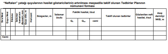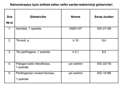 Qeyd edək ki, “Naftalan” yatağı quyularının hasilat göstəricilərinin artırılması məqsədilə təklif olunan Tədbirlər Planının nümunəvi forması, neftin ümumi fiziki-kimyəvi xüsusiyyətləri və balneoterapiya üçün istifadə edilən neftin sanitar-bakterioloji göstəriciləri ilə bağlı əlavələr də qərarda yer alıb.