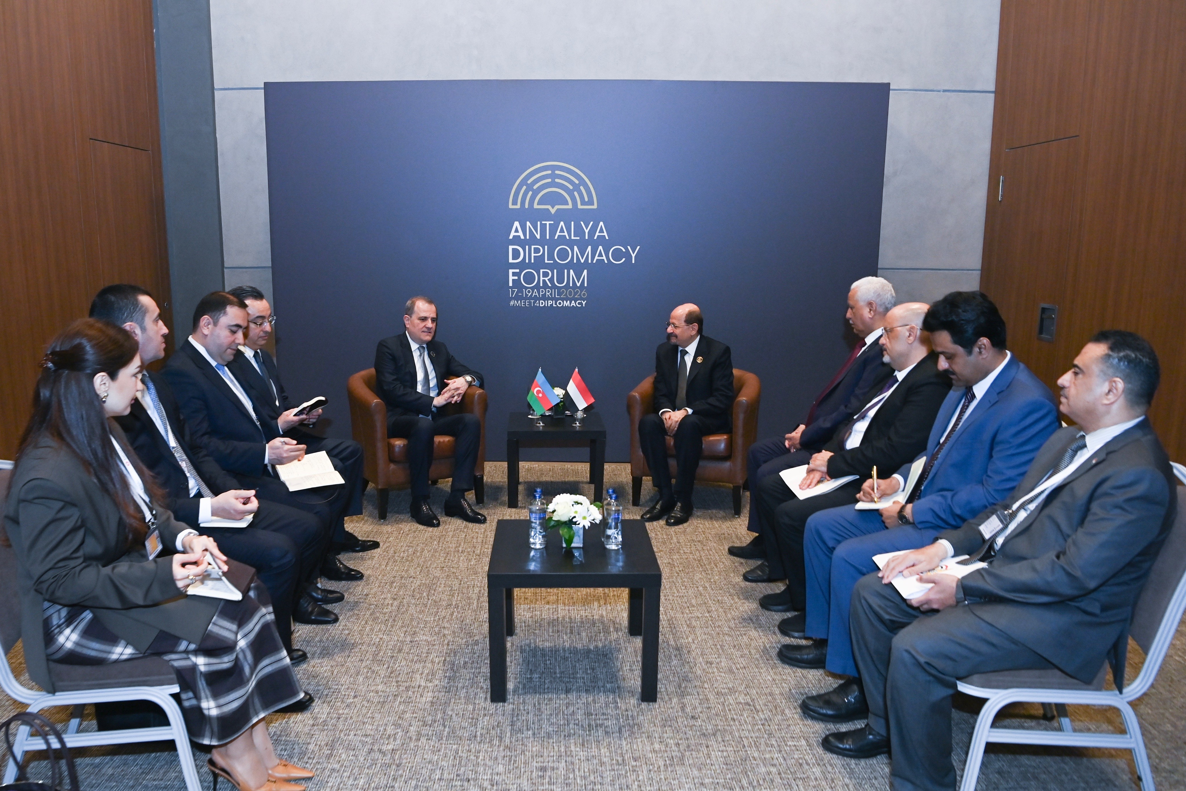 Azərbaycan xarici işlər naziri Ceyhun Bayramov Antalya Diplomatiya Forumu çərçivəsində Yəmən Respublikasının Baş naziri, Xarici İşlər və Xaricdə Yaşayan Vətəndaşlar naziri Şaya Mohsin Zindani ilə görüşüb.
