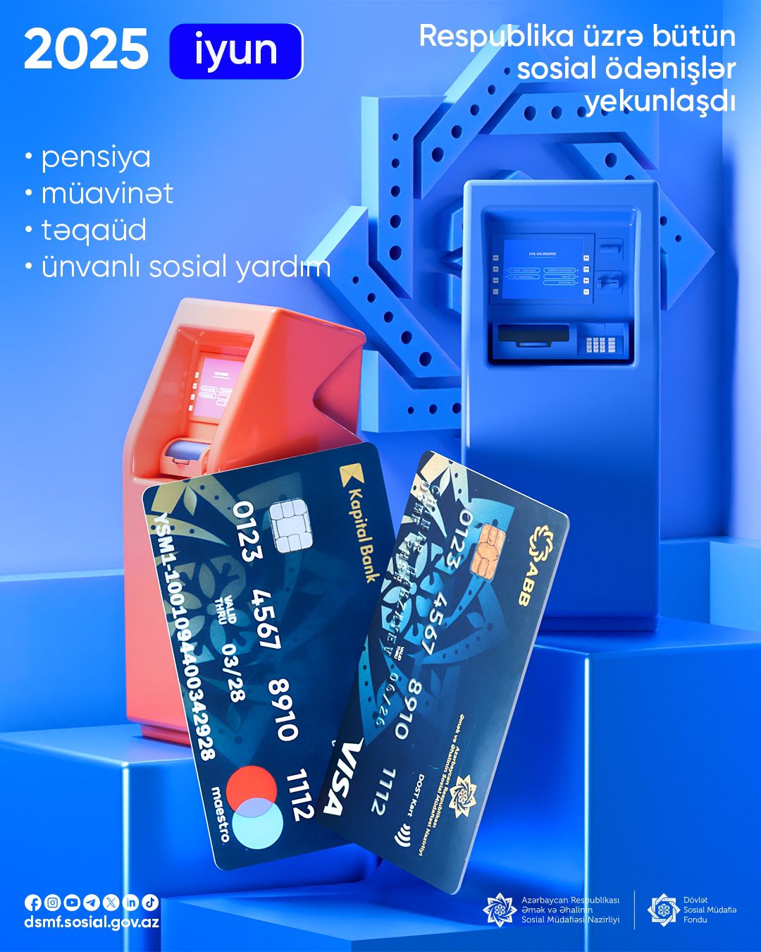 Əmək və Əhalininin Sosial Müdafiəsi Nazirliyinin tabeliyində Dövlət Sosial Müdafiə Fondu tərəfindən iyun ayının müavinət, təqaüd və ünvanlı dövlət sosial yardımları bu gün ödənilib.