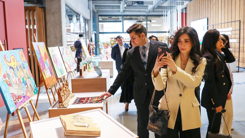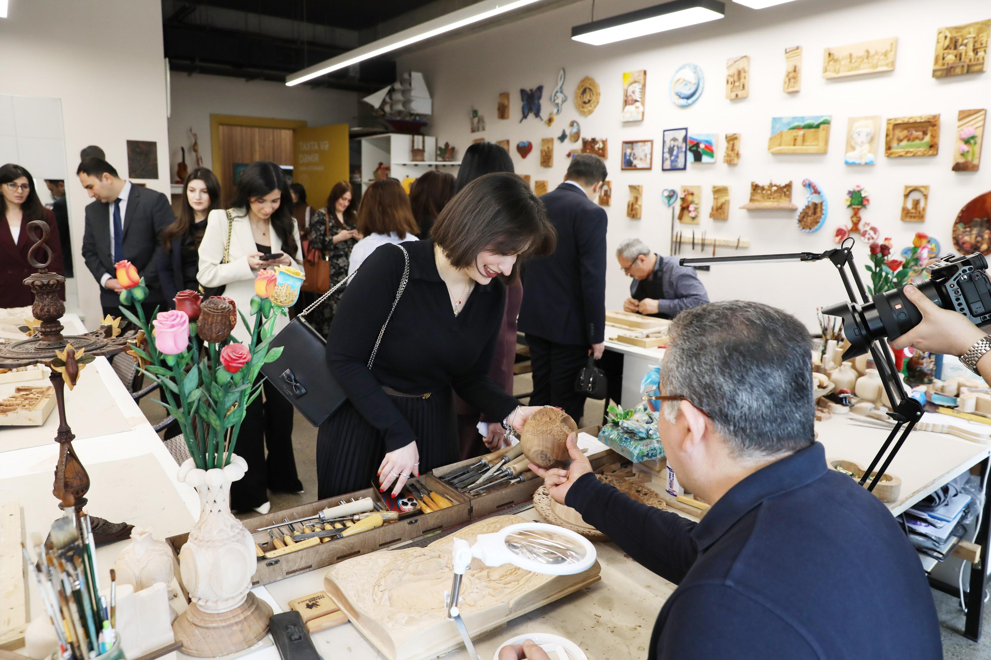 Tədbirin iştirakçıları əvvəlcə təlimçi və benefisiarların əl işlərindən ibarət ekspozisiya ilə tanış olub, Mərkəzin təlim studiyalarında yaradıcılıq prosesini izləyiblər.