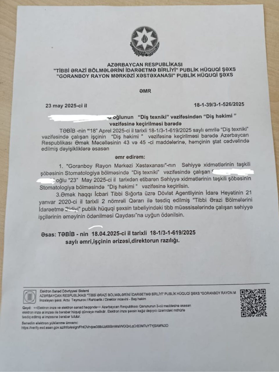 Teleqraf-ın əldə etdiyi məlumata görə, 18 aprel 2025-ci il tarixli 18-1/3-1-619/2025 saylı əmrlə Goranboy Rayon Mərkəzi Xəstəxanasında 23 May 2025-ilə qədər “diş texniki” vəzifəsində çalışan şəxs “diş həkimi” ştatına keçirilib.