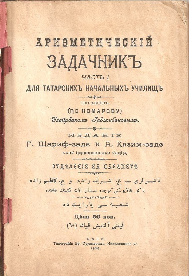 “Hesab məsələləri” adlanan bu kitab 1908-ci ildə o zamankı Nikolayevski (indiki İstiqlaliyyət) küçəsində yerləşən Orucov qardaşlarının mətbəəsində Q.Şərifzadə və A.Kazımzadə tərəfindən nəşr olunub.