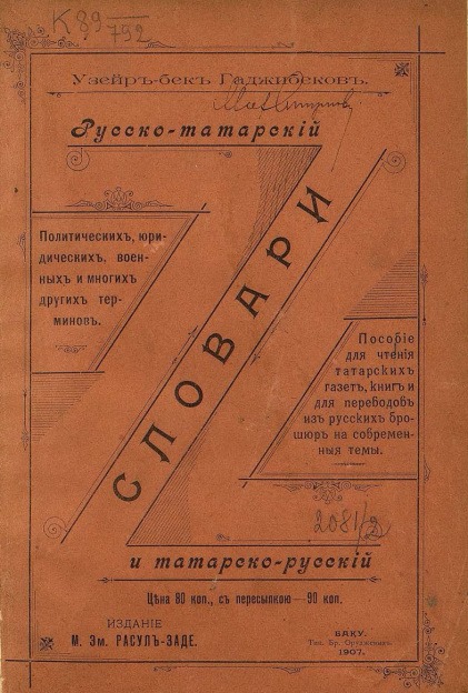 1907-ci ildə çap olunan "Mətbuatda istifadə olunan siyasi, hüquqi, iqtisadi və əsgəri sözlərin türki-rusi və rusi-türki lüğəti" əsərinin redaktoru Məhəmməd Əmin Rəsulzadə olur. Həmin kitabın orijinalı arxivimizdə olmasa da, Rusiya kitabxanalarının birindən elektron kitab şəklində əldə etmişik.