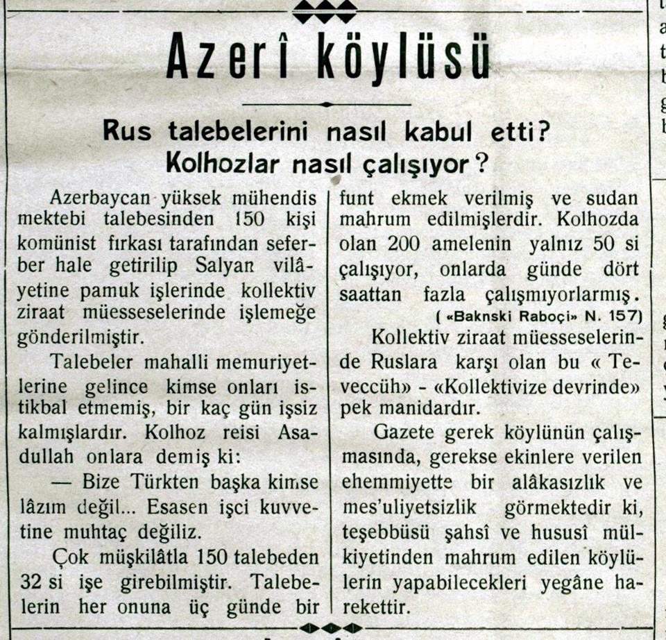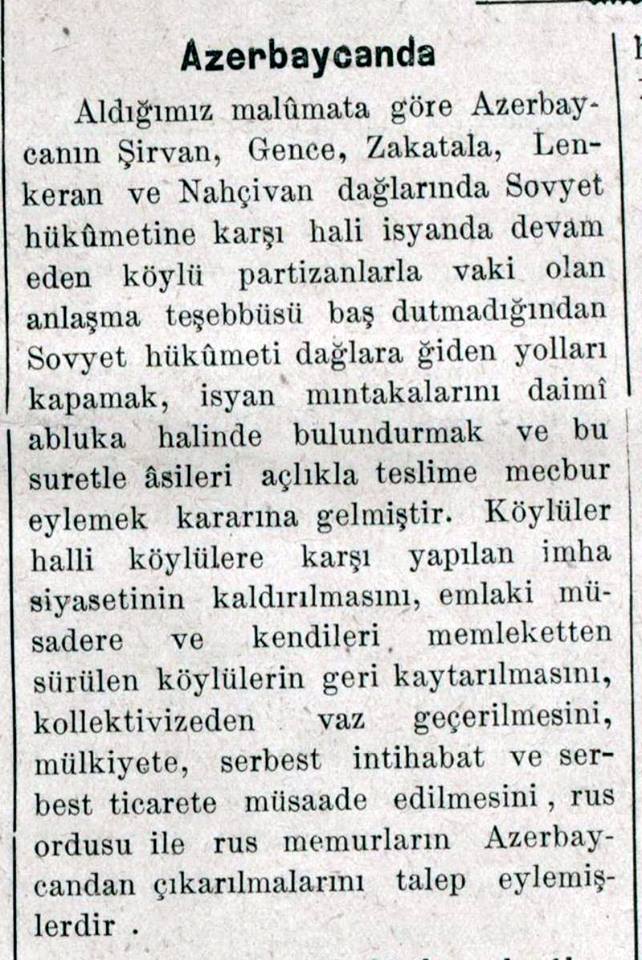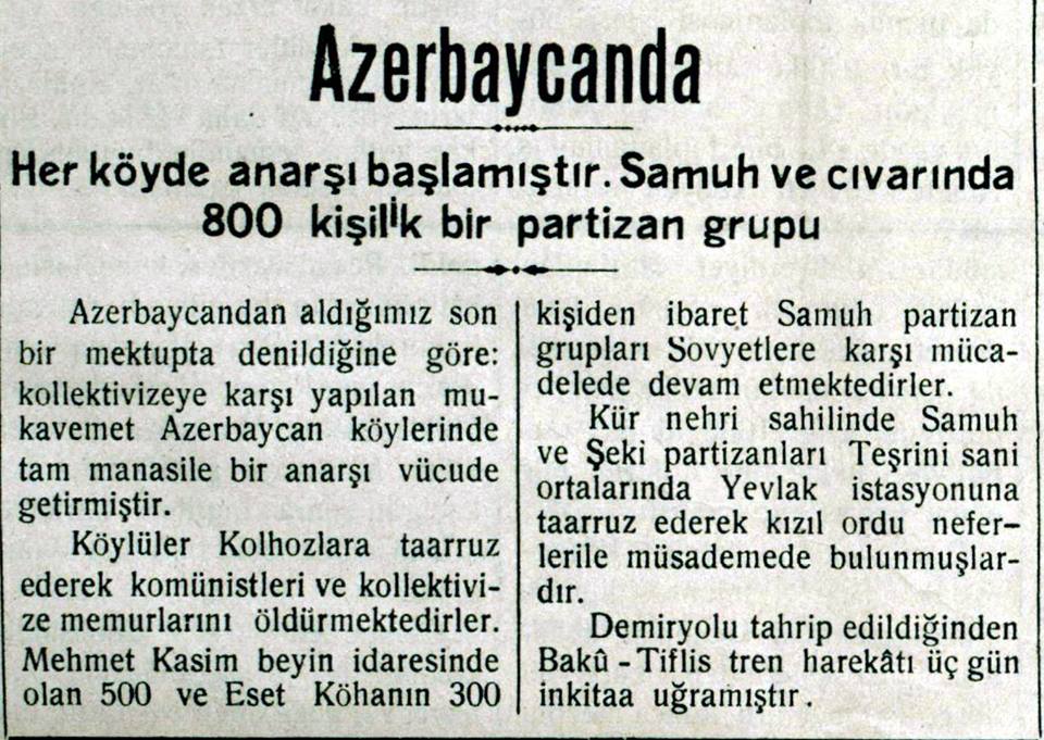 Qəzetin 19-cu sayında kəndlilərin kolxozlara hücum etmələri, kommunistləri və kollektivləşmə məmurlarını məhv etdikləri qeyd olunur: “Məhəmmədqasım bəyin başçılığı ilə 500, Əsəd Köhanın başçılığı ilə 300 nəfərdən ibarət Samux partizan dəstələri Sovetlərə qarşı mücadiləyə davam edirlər. Kür çayı sahilində Samux və Şəki partizanları Yevlax stansiyasına hücum edərək qırmızı ordu ilə qarşıdurmaya giriblər. Dəmiryoluna zərər dəydiyi üçün Bakı-Tiflis qatarı üç gün işləməyib”.