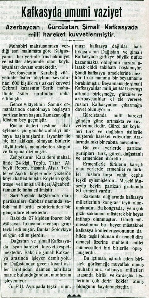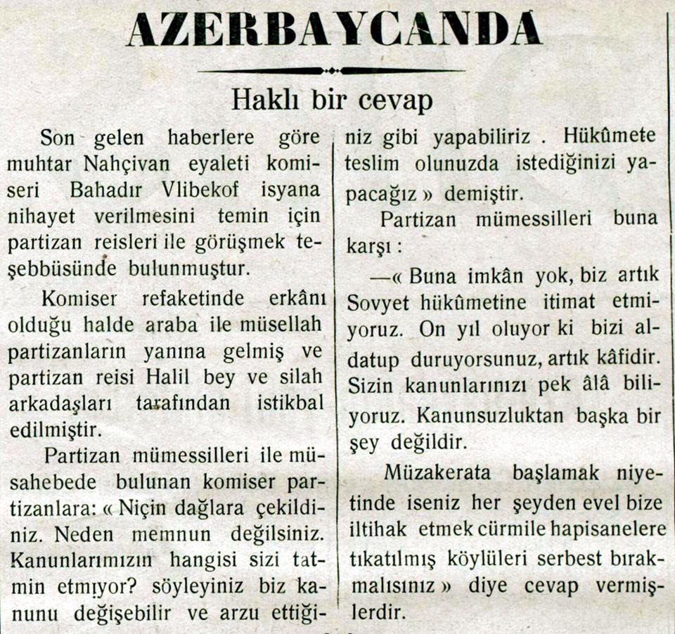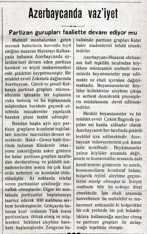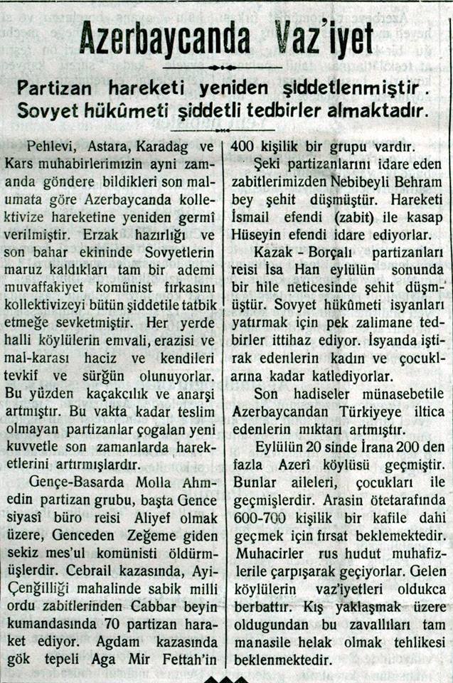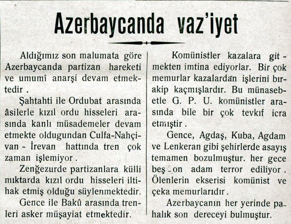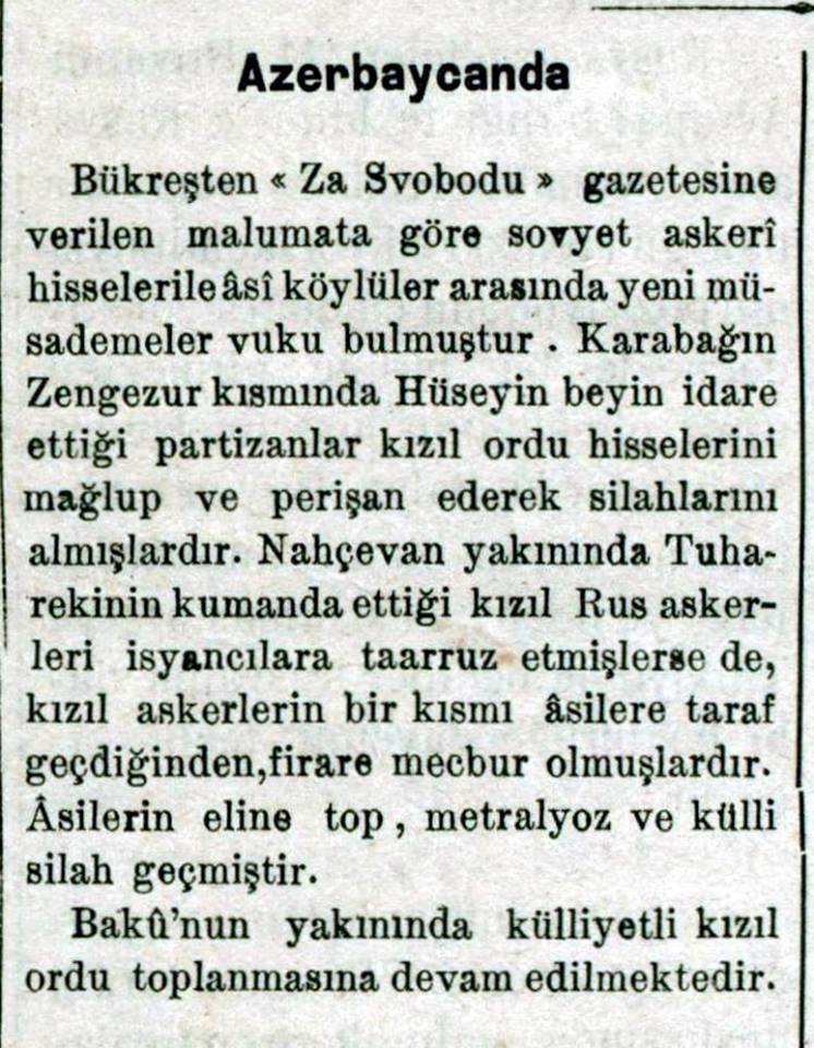 “... Qarabağda bir həftə davam edən qarşıdurma nəticəsində qırmızılar çəkilməyə məcbur olublar. Bolşeviklərin verdikləri məlumata görə, Qarabağ qarşıdurmasında partizan rəislərindən Sultanov öldürülüb. Muğan çölündə partizan hərəkatı artmaqdadır... Üsyançılar Bakı-Culfa dəmir yolunu, Kür çayı üzərindən keçən körpünü partladıblar”.