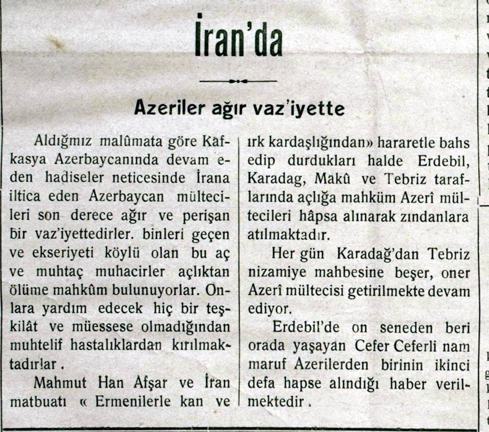“Son günlərdə bolşeviklər Qarabağ yaylaqlarında 42 kəndlini həbs ediblər. Onlar qaçaqlara, üsyançı kəndlilərə kömək etməkdə ittiham edilirdilər. Onların əllərini və gözlərini bağladıqdan sonra Bakı-Culfa dəmiryolu üzərindəki Koraviz stansiyası yaxınlığında iki quyuya salıb, yuxarıdan bir neçə dəfə atəş etdikdən sonra qaz yağı səpərək od vurublar. Qarabağ vilayətinin Cəbrayıl qəzasına bağlı Hacıkənddən Müzəffər, Alış, Əliş, Bahadur bəylər, Qaraxanbəyli kəndindən Emin, Əli bəylər, Halfeşe kəndindən Sarı xan və digərləri bolşeviklər tərəfindən güllələniblər. Azərbaycan qəzalarında kəndlinin silahını toplamaq üçün kommunistlərdən ibarət “beşlər” və “üçlər” adlanan heyətlər təşkil edilib. Bu heyət 5-10 ağsaqqalı cəlb edərək Qurana and içdirdikdən sonra onların vasitəsilə silah toplamağa başlayıblar. Silah verməyənlər də mühakimə edilib güllələndiyi kimi, verənlər də üsyanla əlaqəli hesab edilərək öldürülüblər. Buna görə də hər kənd azı 5 nəfər qurban verib. Naxçıvanın Keçili kəndində 17-si qadın olmaqla 70 kəndli qətlə yetirilib. Onlar ərzaq verməməkdə ittiham olunublar”.