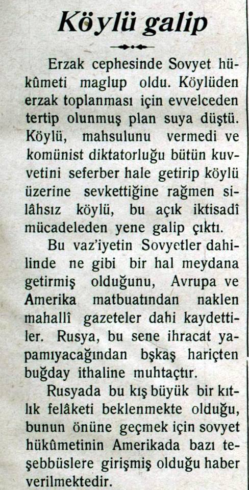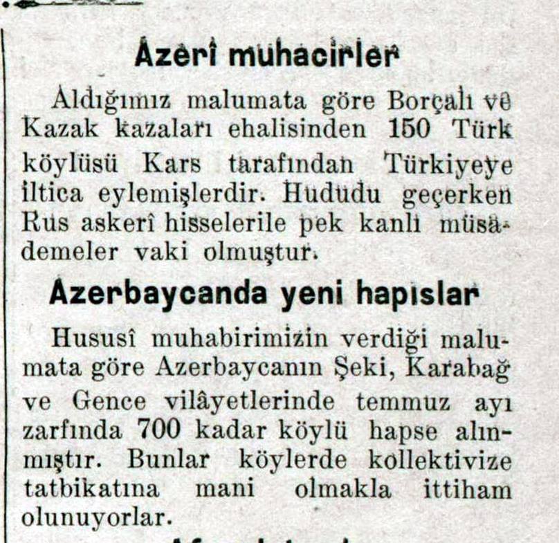 Qəzetin yenə bu sayından öyrənirik ki, iki ay ərzində məhsulunu hökumətə vermək istəməyən 256 kəndli, 12 möhtəkir, 53 sovet məmuru həbs edilib. Onların bir qismi güllələnib, bir qismi isə həbs edilib.