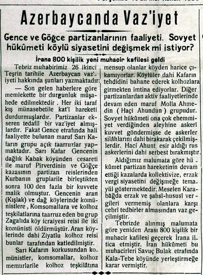 “... Gəncə ətrafında fəaliyyət göstərən, hər kəs tərəfindən tanınan Sarı Qafarın dəstəsi açıq hücumlar etməkdədir. Sarı Qafarın dəstəsi Gəncənin Dağlıq Kabak kəndində cəsarəti ilə tanınan Pirverdinin və Göyçə qəzasının partizan rəislərindən Qurbanın dəstəsi ilə birləşdikdən sonra yüzdən çox üzvə malik olub. Gəncənin aran və dağ kəndlərində kommunistlərə, komsomollara və kolxoz təşkilatlarına hücum edən bu qrup Zağalıda kənd icraiyyəsi rəisi və iki kommunisti öldürüblər. Aran kəndlərində də Ziyadlı kolxoz rəisi onlar tərəfindən qətlə yetirilib. Sarı Qafarın qorxusundan kommunistlər, komsomollar, kolxoz məmurları və kolxoz təşkilatına mənsub olanlar kənddən kənara çıxa bilmirlər. Kəndlilər də Qafarın təhdidini bəhanə edərək kolxozlara getməkdən imtina edirlər. Aktiv fəaliyyətə davam edən partizan dəstələrindən biri də Molla Əhmədin (Hacı Axundun) dəstəsidir. Sovet hökuməti ona çox əhəmiyyət verdiyi üçün hərbi qüvvə göndərsə də, əsgərlər silahlarını buraxaraq qaçıblar. Hacı Axund hətta əsir aldığı rus əsgərlərini azad edib”.
