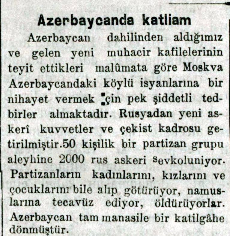 “Gəncə, Qarabağ, Şəki, Ağdaş, Göyçay və Muğan vilayətlərində hərəkət edən partizanlara ərzaq və cəbbəxana daşımaqda ittiham edilən 200-dən çox Azərbaycan qadını rus qırmızı ordu komandanlığı tərəfindən həbs edilərək Şimali Rusiyaya sürgün ediliblər. Sürgün edilən qadınlar arasında 16-17 yaşlı gənc qızlar, qoca və hamilə qadınlar da vardır”.