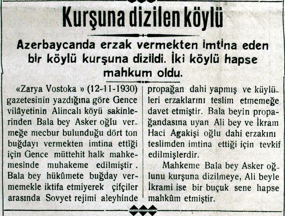 Qəzetin bu sayından onu da öyrənirik ki, bolşeviklər mallarını hökumətə vermək istəməyən kəndliləri güllələyir, ən yaxşı halda isə həbs edirlər. Məsələn, Gəncənin Alıncalı kənd sakini Balabəy Əsgəroğlu 4 ton buğdasını vermədiyi üçün məhkəmə güllələnməsinə hökm verib. Digər iki kəndli isə il yarım müddətinə həbs edilib.