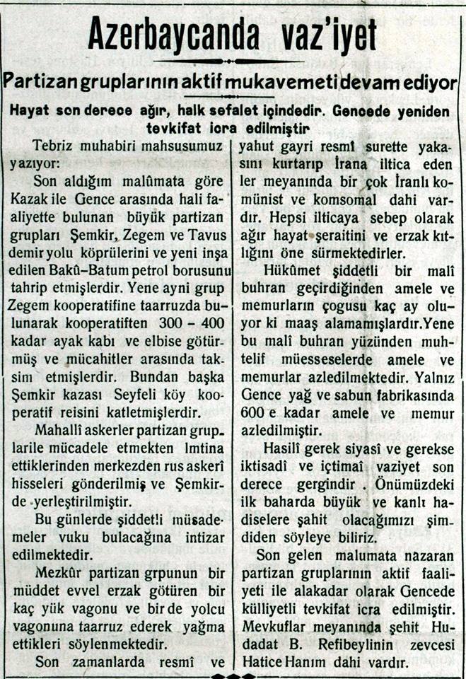 “Qazax ilə Gəncə arasında fəaliyyət göstərən partizan dəstələri Şəmkir, Zəyəm, Tovuz dəmiryolu körpülərini və yeni inşa edilən Bakı-Batum neft borusuna ziyan vurublar. Yenə eyni dəstə Zəyəm kooperativinə hücum edərək oradan 300-400 ayaqqabı və paltar götürüb mücahidlər arasında bölüblər. Bundan başqa Şəmkir qəzası Seyfəli kənd kooperativ rəisini qətlə yetiriblər... Partizan dəstələrinin aktiv fəaliyyəti ilə əlaqədar olaraq Gəncədə kütləvi həbslər başlayıb. Tutulanlar arasında şəhid Xudadat bəy Rəfibəylinin zövcəsi Xədicə xanım da vardır”.