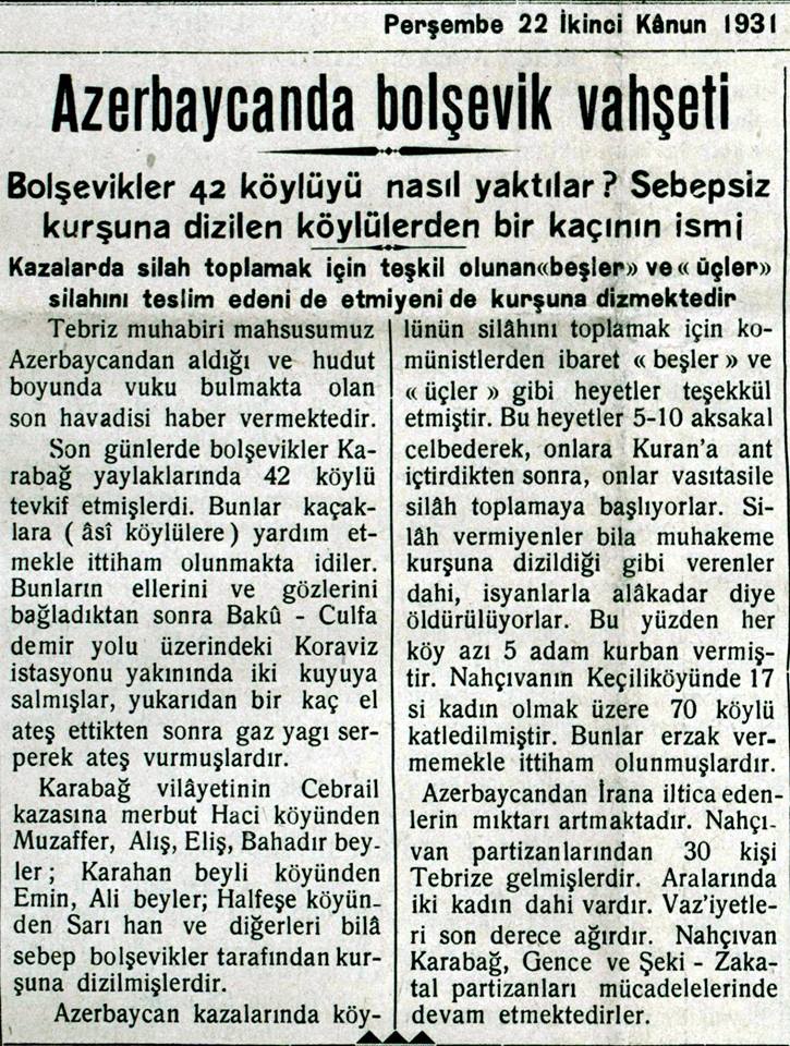 “Bildiriş”in 1931-ci ildə çap olunan 25-ci sayı “Azərbaycanda bolşevik vəhşəti. Bolşeviklər 42 kəndlini necə yandırdılar? Səbəbsiz güllələnən kəndlilərdən bir neçəsinin adı” başlığı və yarımbaşlığı ilə nəşr olunub. Təbriz müxbirinin verdiyi xəbərdə yazılır: