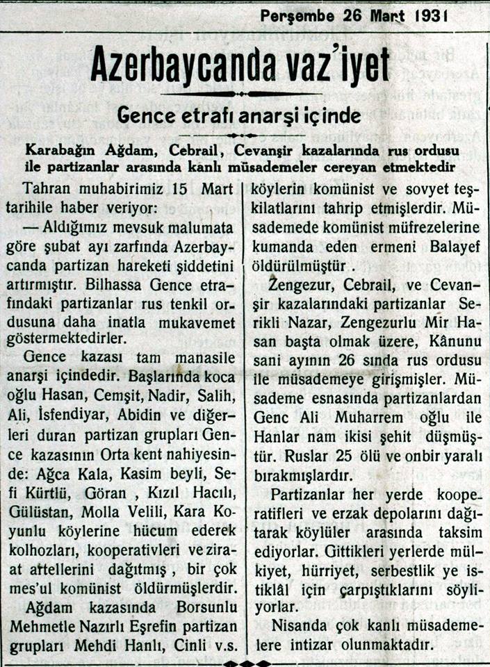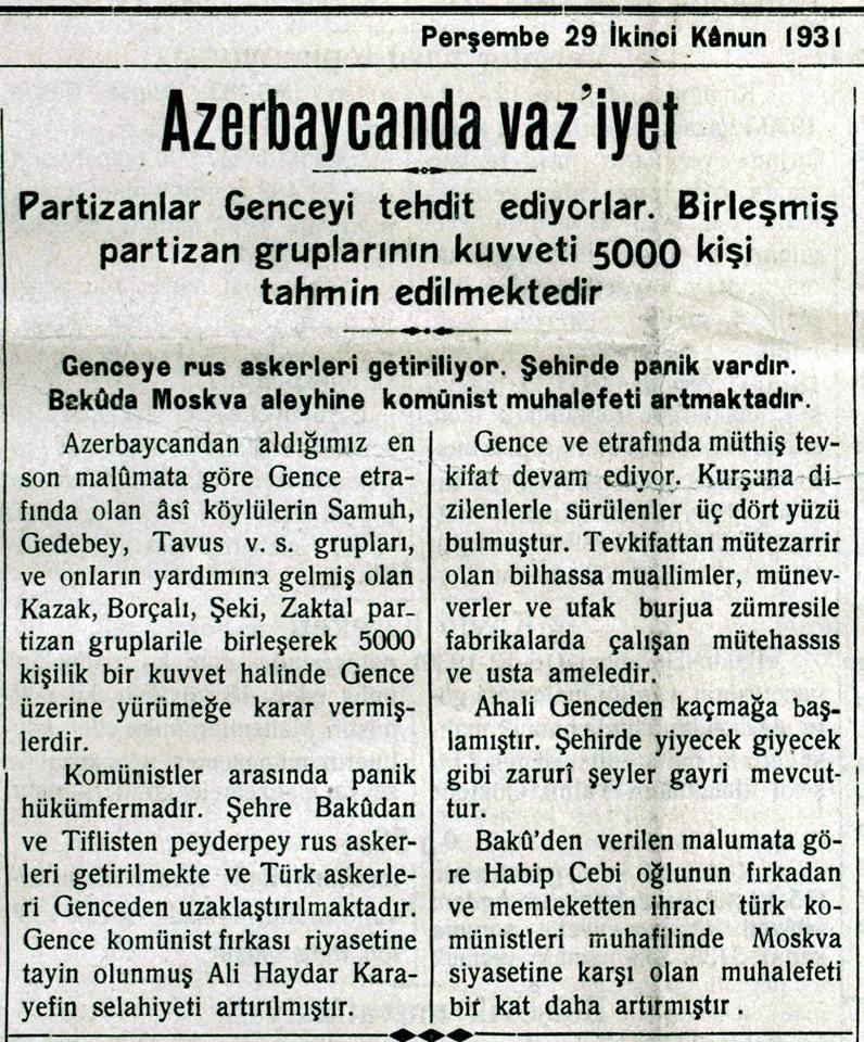 Qəzetin 26 mart 1931-ci il tarixli 34-cü sayında Gəncə ətrafında anarxiyanın hökm sürdüyü bildirilir: