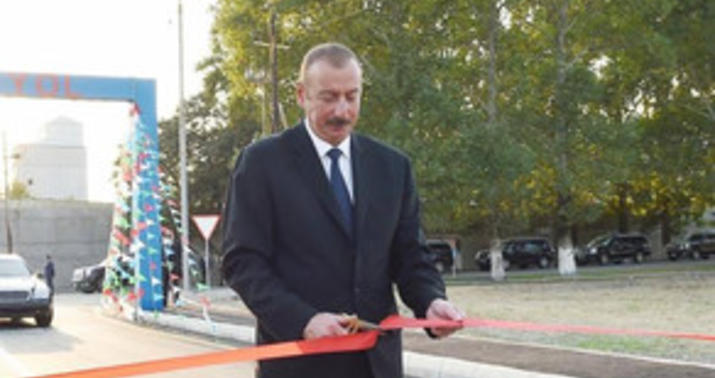 Dövlət başçısı yolun rəmzi açılışını bildirən lenti kəsib.