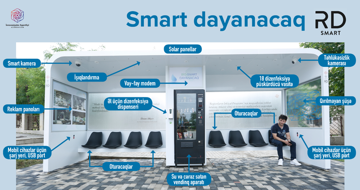 Günəş enerjisi ilə işləyən “Smart dayanacaq” hər 10 dəqiqədən bir 10 saniyə ərzində Azərbaycan alimlərinin ixtirası olan spirtsiz, xlorsuz və insan orqanizminə zərər yetirməyən “BİOSANİS” dezinfeksiya məhlulunu havaya püskürdərək dayanacaqda gözləyən sərnişinləri virusa yoluxmaqdan qoruyur. Bundan əlavə dayanacaqda əl üçün dezinfeksiya dispenseri də yerləşdirilib. Dayanacaq həmçinin pulsuz vay-fay, mobil cihazlar üçün 4 şarj yeri, USB port, 2 təhlükəsizlik kamerası və su satan vendinq aparatı ilə təchiz olunub. Sərnişinlərin rahatlığı üçün avtobusların hərəkət qrafiki isə xüsusi paneldə əks olunacaq. Ağıllı avtobus dayanacağının bütün enerji tələbatı solar panellər vasitəsi ilə təmin olunur. Rayon parkında yerləşdirilmiş solar panellər vasitəsilə işləyən daha iki növ ağıllı oturacaq pulsuz vay-fay, mobil cihazlar üçün şarj və USB portla təmin olunub.