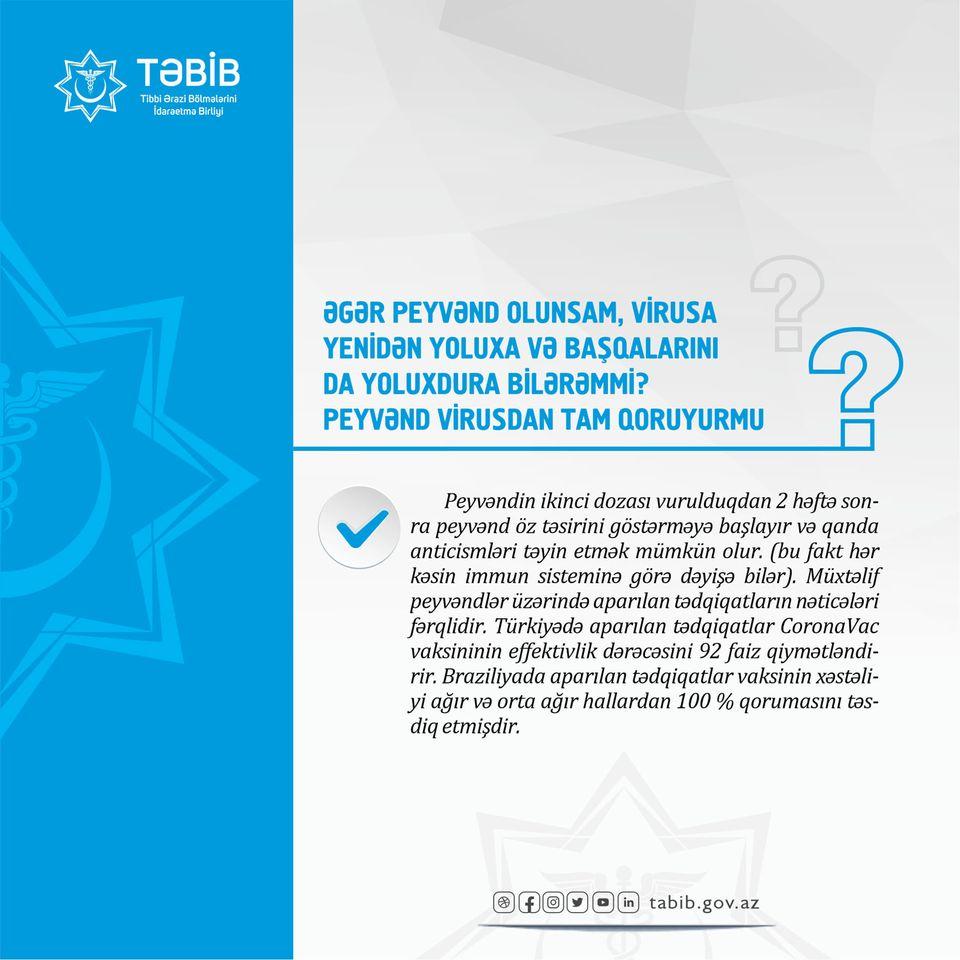 Tibbi Ərazi Bölmələrini İdarəetmə Birliyi (TƏBİB) peyvənd olunan şəxsin virusa yenidən yoluxma ehtimalının olub-olmaması ilə bağlı məsələyə aydınlıq gətirib.