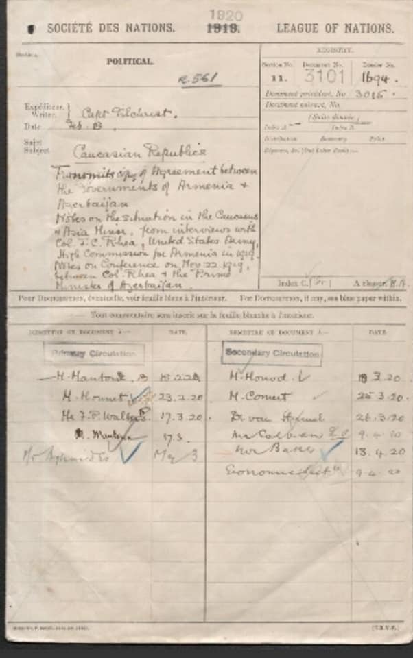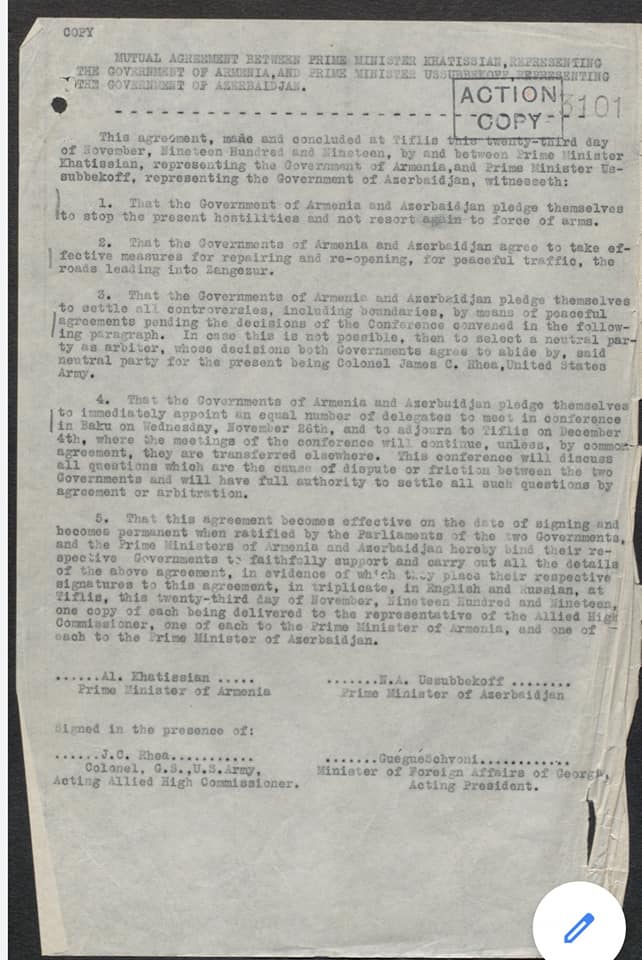 Bu sənədi uzun zaman axtarırdım və nəhayət, Amerika Konqres kitabxanasına yazdığıma cavab gəldi. Sənədin tam surətini mənə elektron formada göndərdilər. Demək, Ermənistanla Azərbaycan arasında bağlanan bu sazişi Azərbaycan və Ermənistanın baş nazirləri N. Yusifbəyli və A.Xatisov, təminatçı sifəti ilə ABŞ tərəfindən Ceyms Rey və Gürcüstanın xarici işlər naziri E.Gegeçkori imzalamışdılar.