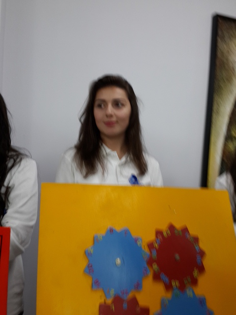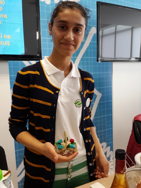 Kimya-bilologiya təmayülünün tələbəsi Fidan Atakişiyeva çürümüş südə təbii boya qatmaqla təbii plastilin hazırladı. Həvəslə öz “ixtirasını” izah etdi: “Südü isidirəm, sirkə vasitəsilə çürüdürəm, qida üçün istifadə olunan istənilən rəng qatıram, süzüb, suçəkənlə suyunu tam alıram. Molekulyar quruluşlu birləşmə polimer birləşməyə çevrilir. Plastilindən fərqli olaraq bunun tərkibində kimyəvi qatqı yoxdur, uşaqlar üçün bunu əminliklə istifadə etmək olar. İstənilən fiqur düzəltmək mümkündür. Mən adətən bəzək əşyaları, suvenirlər hazırlayıram”.