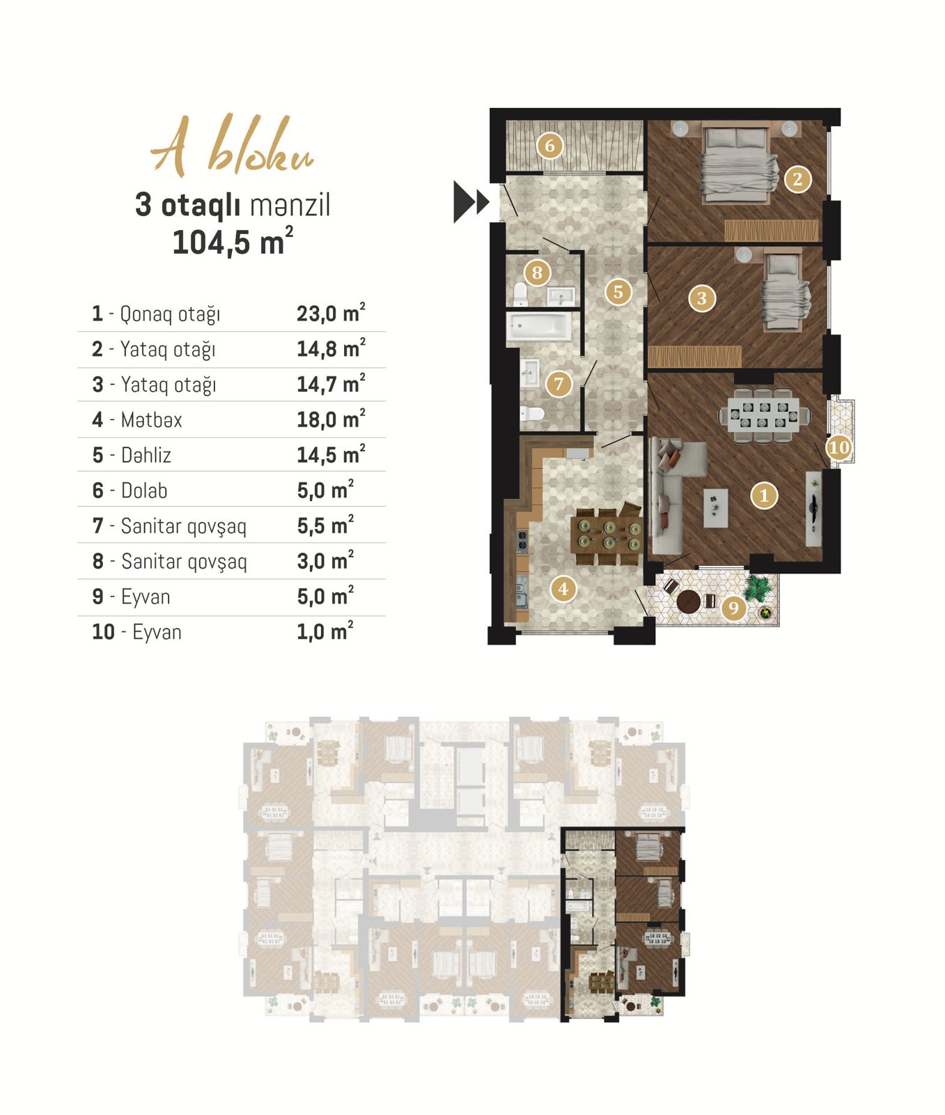 Bina 3 blokdan ibarətdir: 2 blok – hər biri 15 mərtəbə, 1 blok isə – 17 mərtəbə;