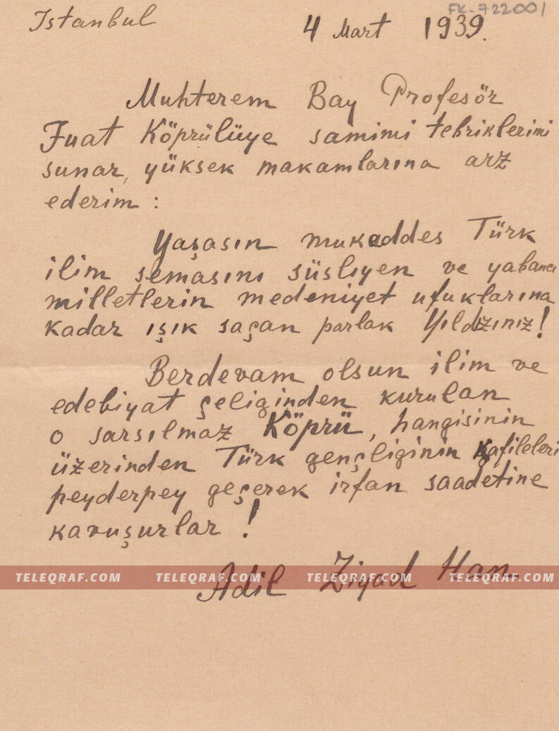 Görünür, Adil xan da həmin universitetin əməkdaşı kimi Köprülünü məktubla təbrik etməyi vacib bilib.