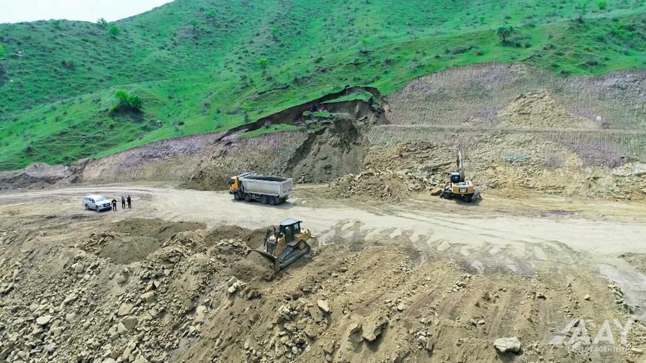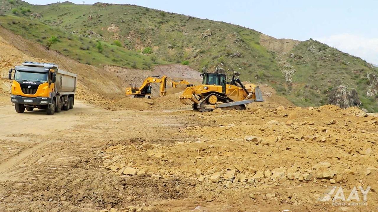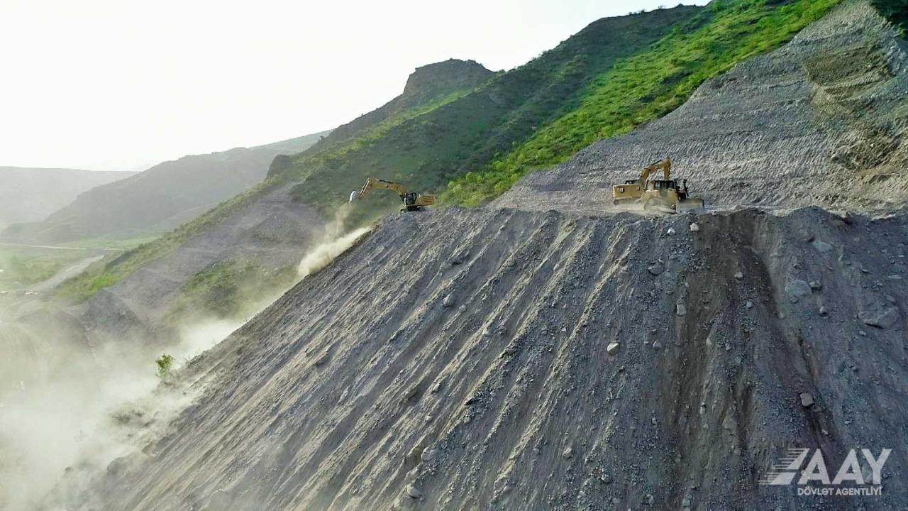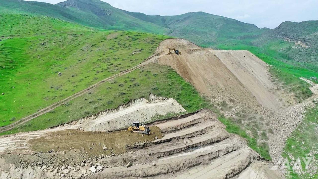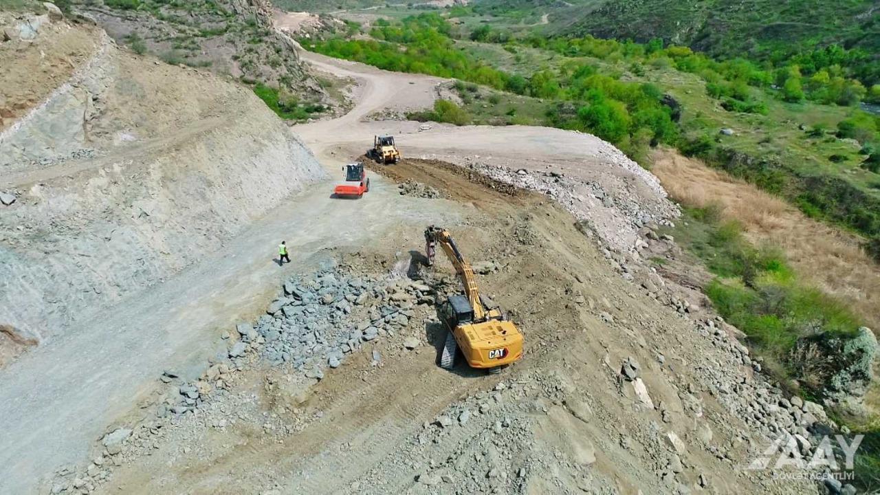 Qubadlı rayonunda çətin relyefə malik ərazidən keçərək Eyvazlı kəndinə gedən avtomobil yolunun layihə eninin alınması üçün “İnşaat Norma və Qaydaları”na uyğun olaraq qaya qruntları dağıdılmaqla torpaq yatağının inşası aparılır.