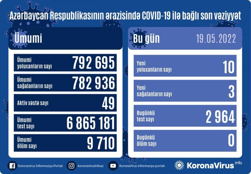 Azərbaycanda koronavirus (COVID-19) infeksiyasına 10 yeni yoluxma faktı qeydə alınıb, 3 nəfər müalicə olunaraq sağalıb.
