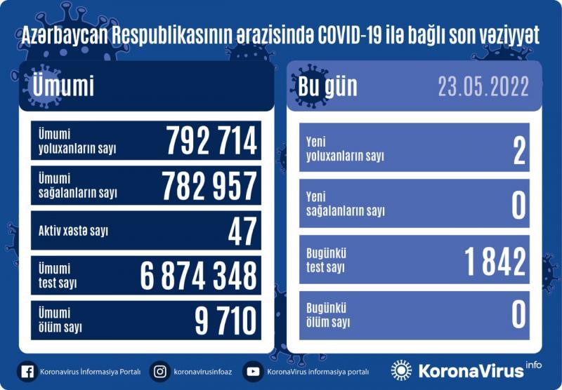 Azərbaycanda koronavirus (COVID-19) infeksiyasına 2 yeni yoluxma faktı qeydə alınıb, sağalma sayı isə sıfır olub.