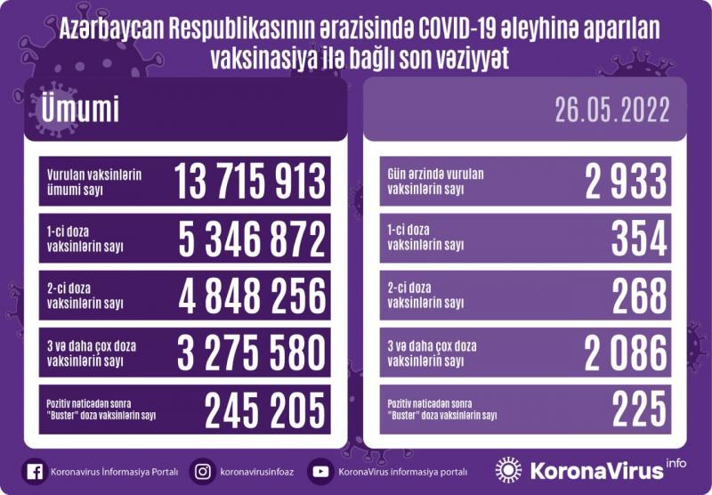 Azərbaycanda bu günə qədər vurulan vaksinlərin ümumi sayı 13 715 913, birinci doza peyvəndlərin ümumi sayı 5 346 872, ikinci doza vaksinlərin sayı 4 848 256 təşkil edib. Üç və daha çox doza vaksinlərin sayı 3 275 580, pozitiv nəticədən sonra “buster” doza vaksinlərin sayı isə 245 205 olub.
