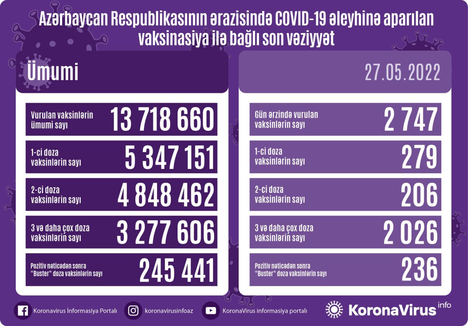 Azərbaycanda bu günə qədər vurulan vaksinlərin ümumi sayı 13 718 660, birinci doza peyvəndlərin ümumi sayı 5 347 151, ikinci doza vaksinlərin sayı 4 848 462 təşkil edib. Üç və daha çox doza vaksinlərin sayı 3 277 606, pozitiv nəticədən sonra buster doza vaksinlərin sayı isə 245 441 olub.