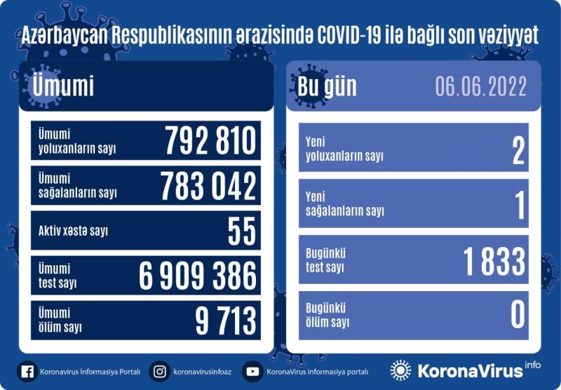 Azərbaycanda koronavirus (COVID-19) infeksiyasına 2 yeni yoluxma faktı qeydə alınıb, 1 nəfər müalicə olunaraq sağalıb.