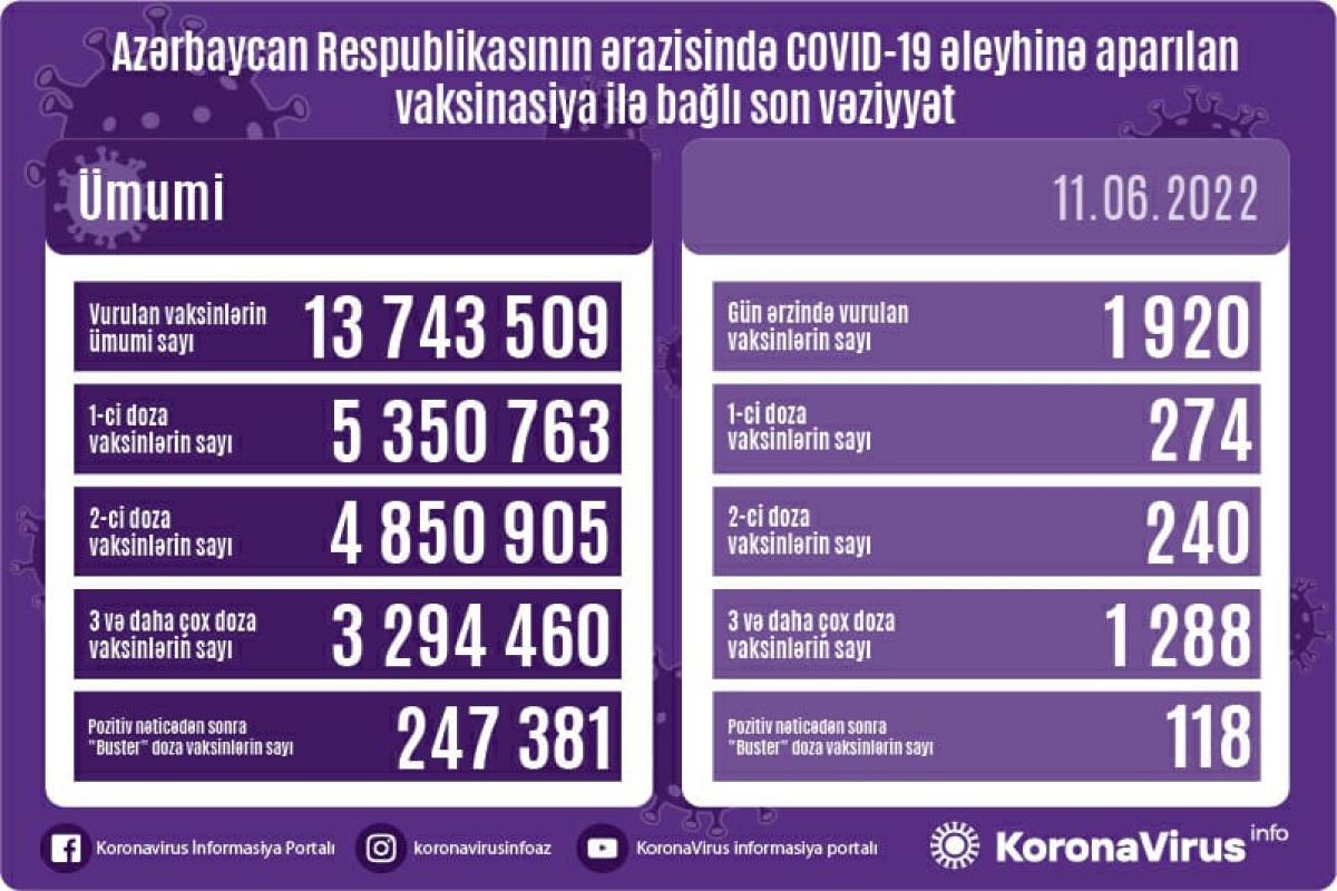 Azərbaycanda bu günə qədər vurulan vaksinlərin ümumi sayı 13 743 509, birinci doza peyvəndlərin ümumi sayı 5 350 763, ikinci doza vaksinlərin sayı 4 850 905 təşkil edib. Üç və daha çox doza vaksinlərin sayı 3 294 460, pozitiv nəticədən sonra buster doza vaksinlərin sayı isə 247 381 olub.