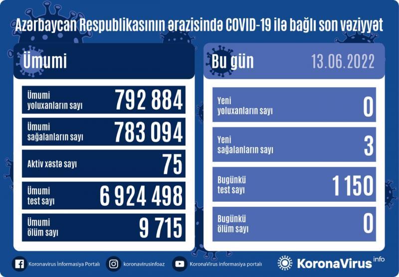 Azərbaycanda koronavirus (COVID-19) infeksiyasına yeni yoluxma faktı qeydə alınmayıb, 3 nəfər müalicə olunaraq sağalıb.
