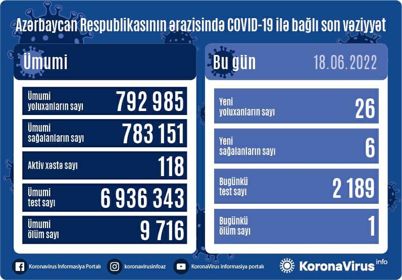 Azərbaycanda koronavirus (COVID-19) infeksiyasına 26 yeni yoluxma faktı qeydə alınıb, 6 nəfər müalicə olunaraq sağalıb.