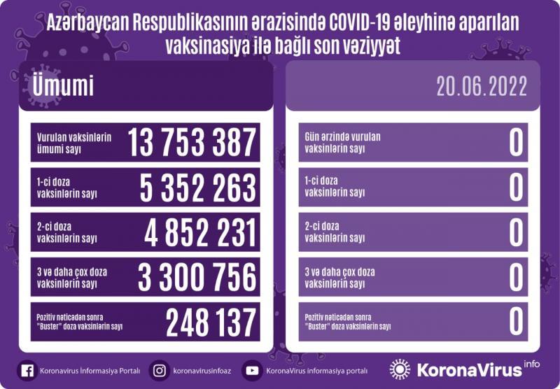 Azərbaycanda bu günə qədər vurulan vaksinlərin ümumi sayı 13 753 387, birinci doza peyvəndlərin ümumi sayı 5 352 263, ikinci doza vaksinlərin sayı 4 852 231 təşkil edib. Üç və daha çox doza vaksinlərin sayı 3 300 756, pozitiv nəticədən sonra buster doza vaksinlərin sayı isə 248 137 olub.
