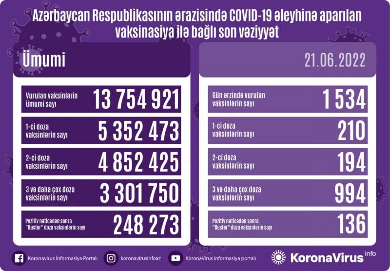 Azərbaycanda bu günə qədər vurulan vaksinlərin ümumi sayı 13 754 921, birinci doza peyvəndlərin ümumi sayı 5 352 473, ikinci doza vaksinlərin sayı 4 852 425 təşkil edib. Üç və daha çox doza vaksinlərin sayı 3 301 750, pozitiv nəticədən sonra buster doza vaksinlərin sayı isə 248 273 olub.