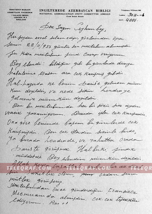 Hacıkərim bəyin Ceyhun bəyə göndərdiyi 7 məktubun tarixi 1956-cı ildir. Məktublardan aydın olur ki, H.Əhmədzadə Londonda yaşayır, burada Azərbaycanla bağlı cəmiyyət qurub, müəyyən qədər də imkanlara sahibdir.