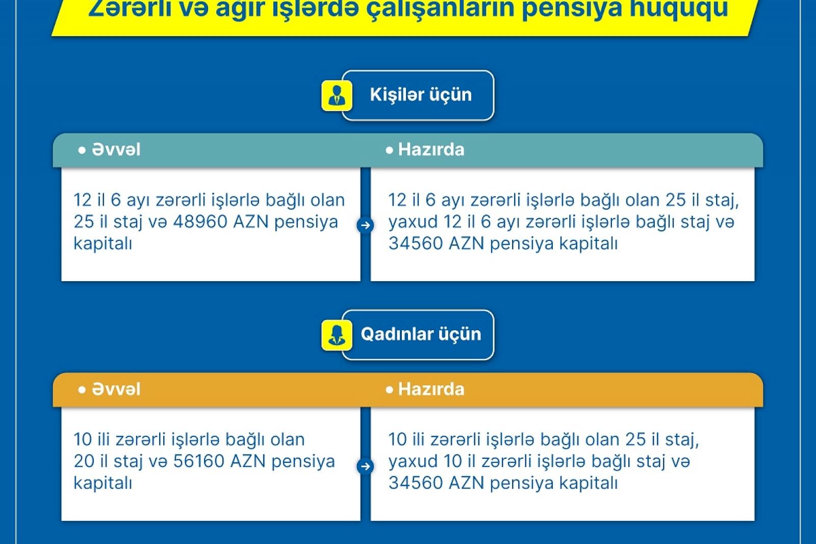 bundan sonra - 12 il 6 ayı zərərli işlərlə bağlı olan 25 il staj, yaxud 12 il 6 ay zərərli işlərlə bağlı staj və fərdi hesabda 34560 manat pensiya kapitalı tələb olunacaq.